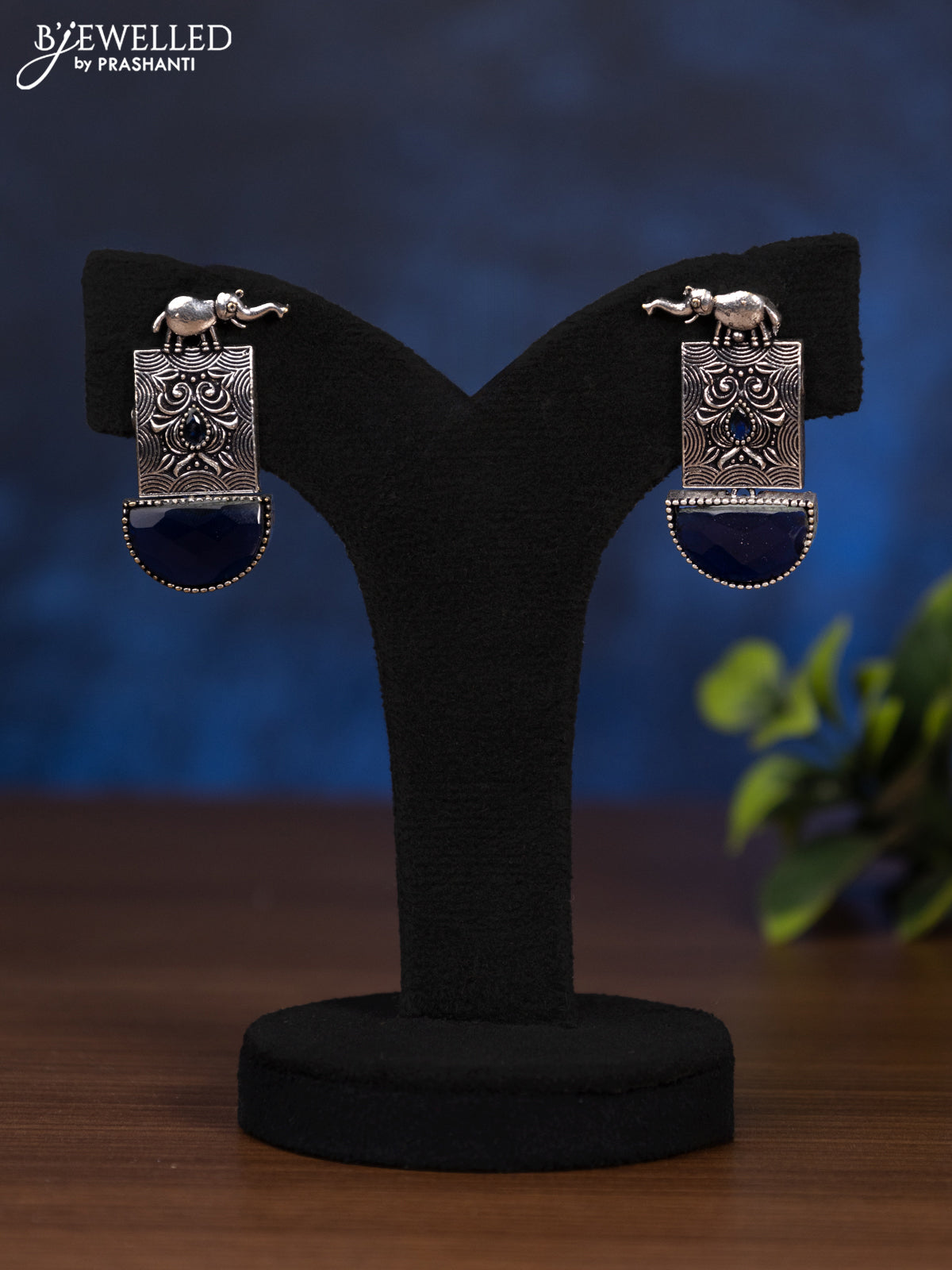 Oxidised earring elephant with sapphire stones