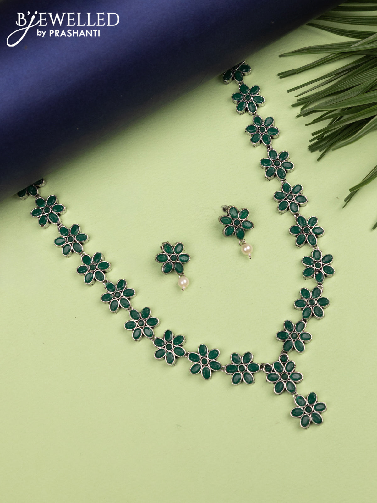 Oxidised haaram floral design with emerald stones
