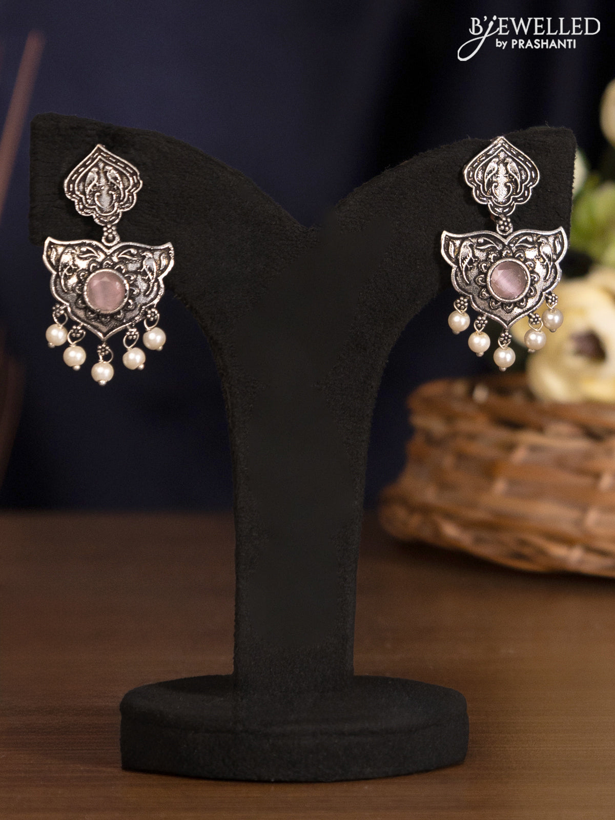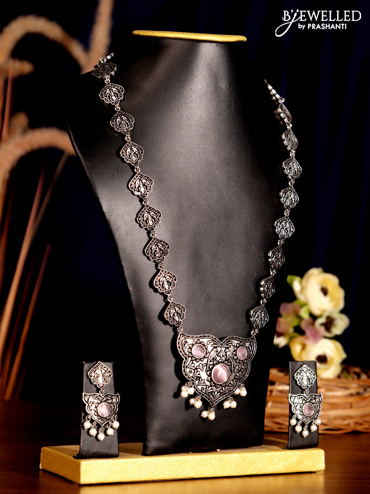Oxidised haaram with baby pink stones and pearl hangings