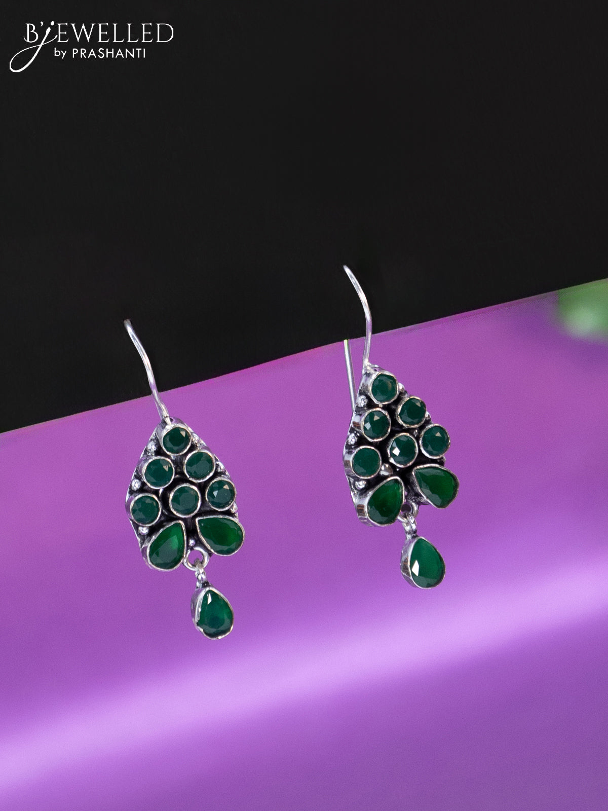 Oxidised hanging type earring with emerald stones