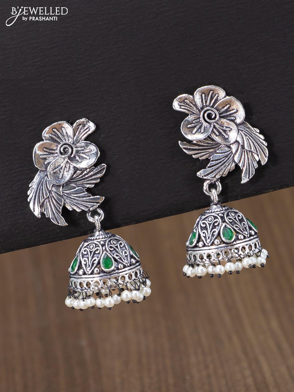 Oxidised jhumka floral & leaf design with emerald stones and pearl hangings