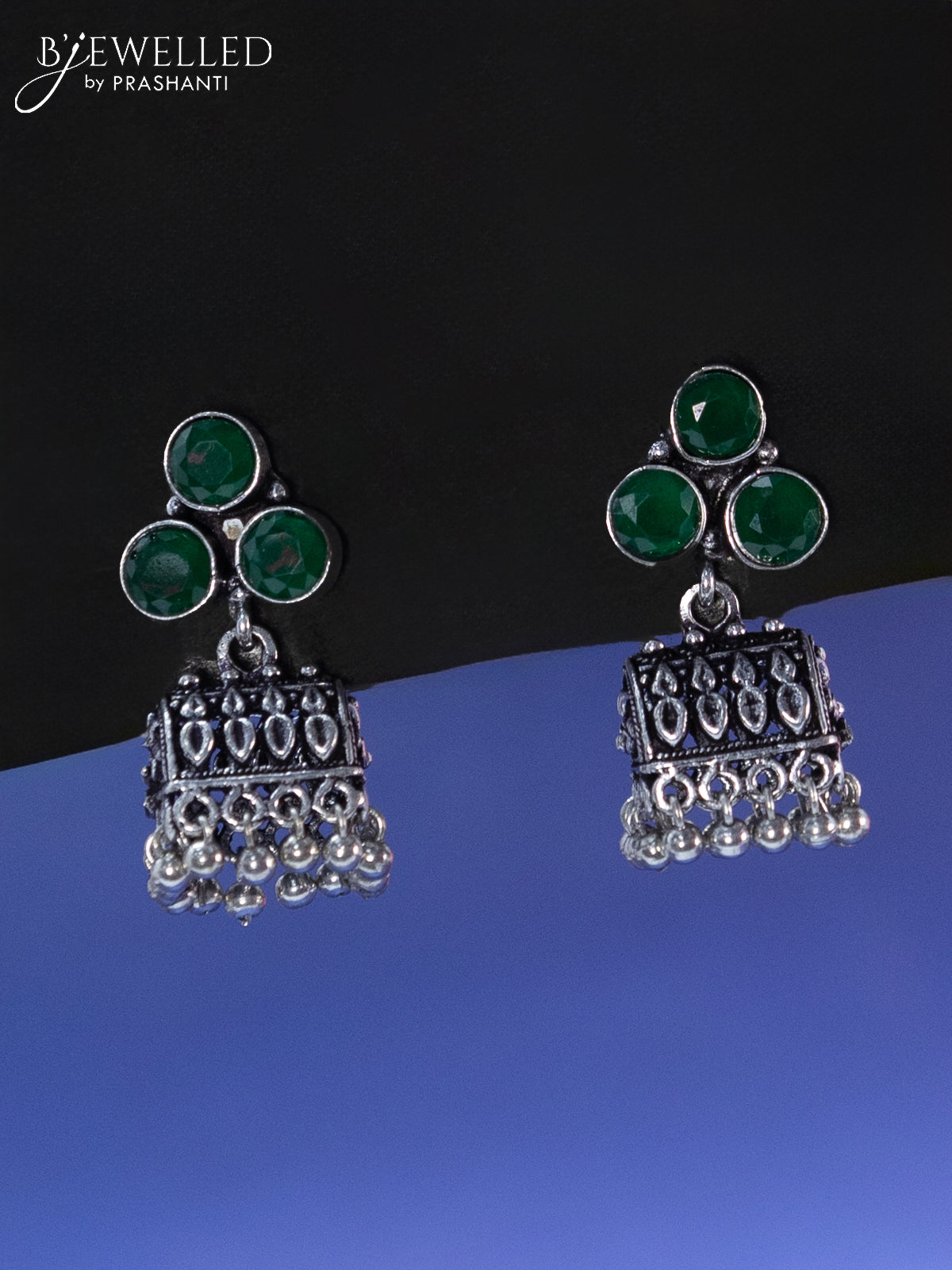 Oxidised jhumka with emerald stone and hangings