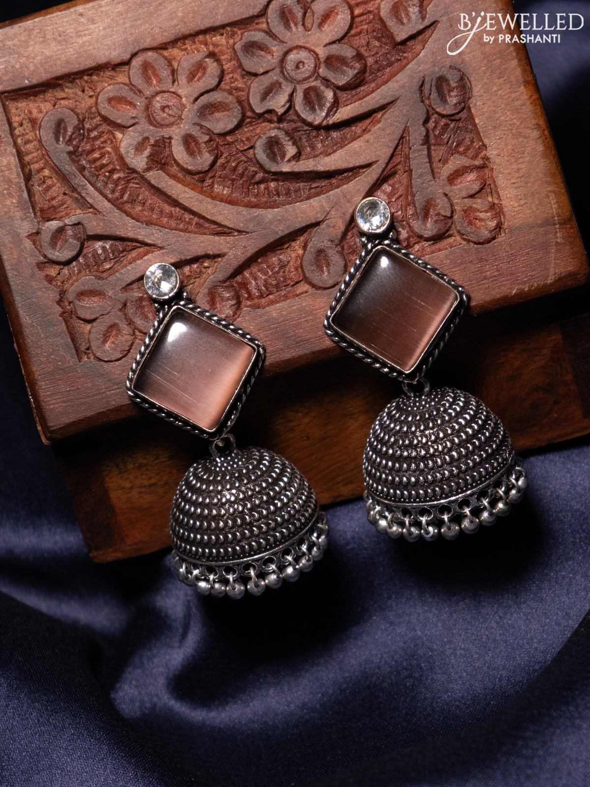 Oxidised jhumka with rosy brown & white stones and silver beads hanging