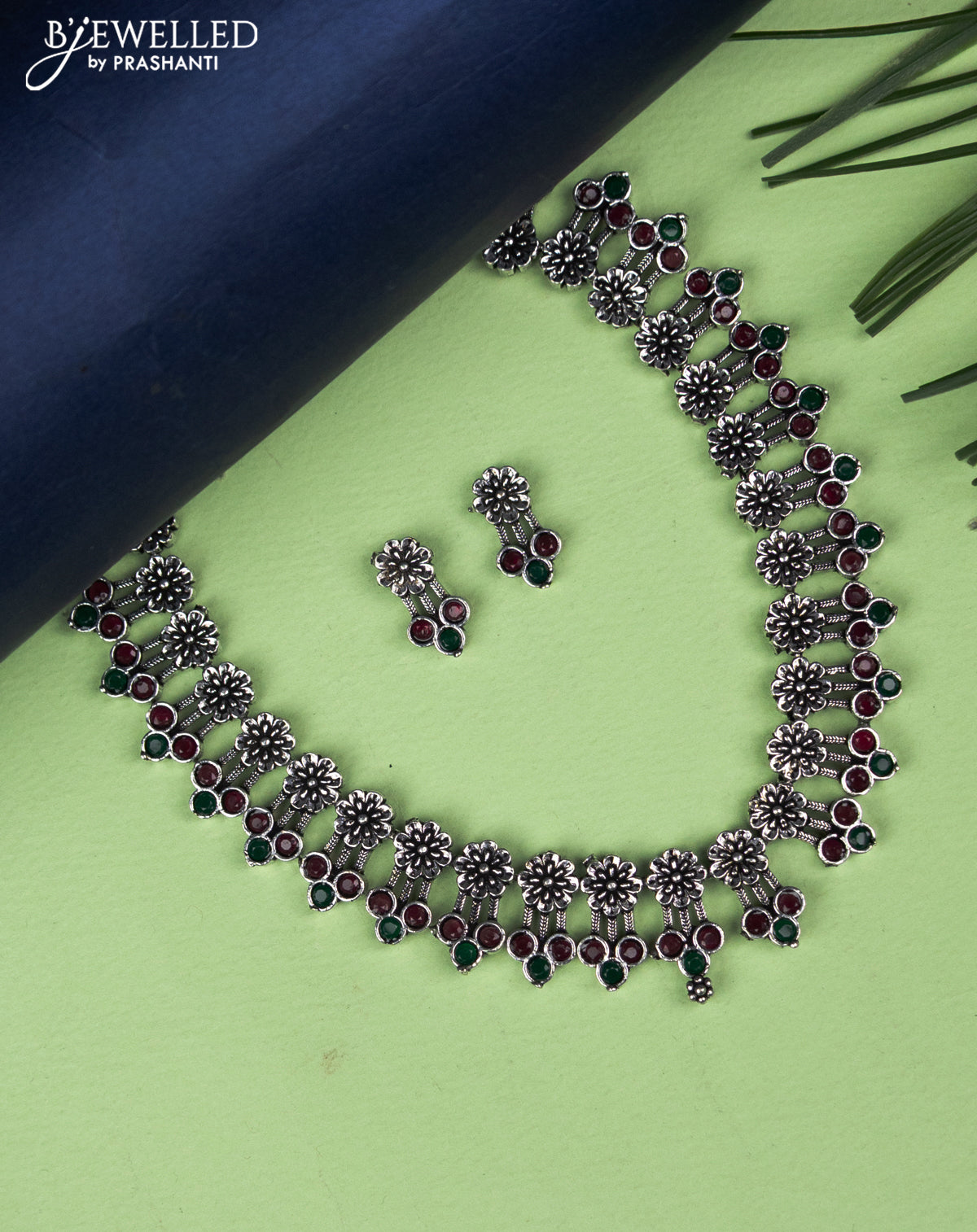 Oxidised necklace floral design with emerald and ruby stones