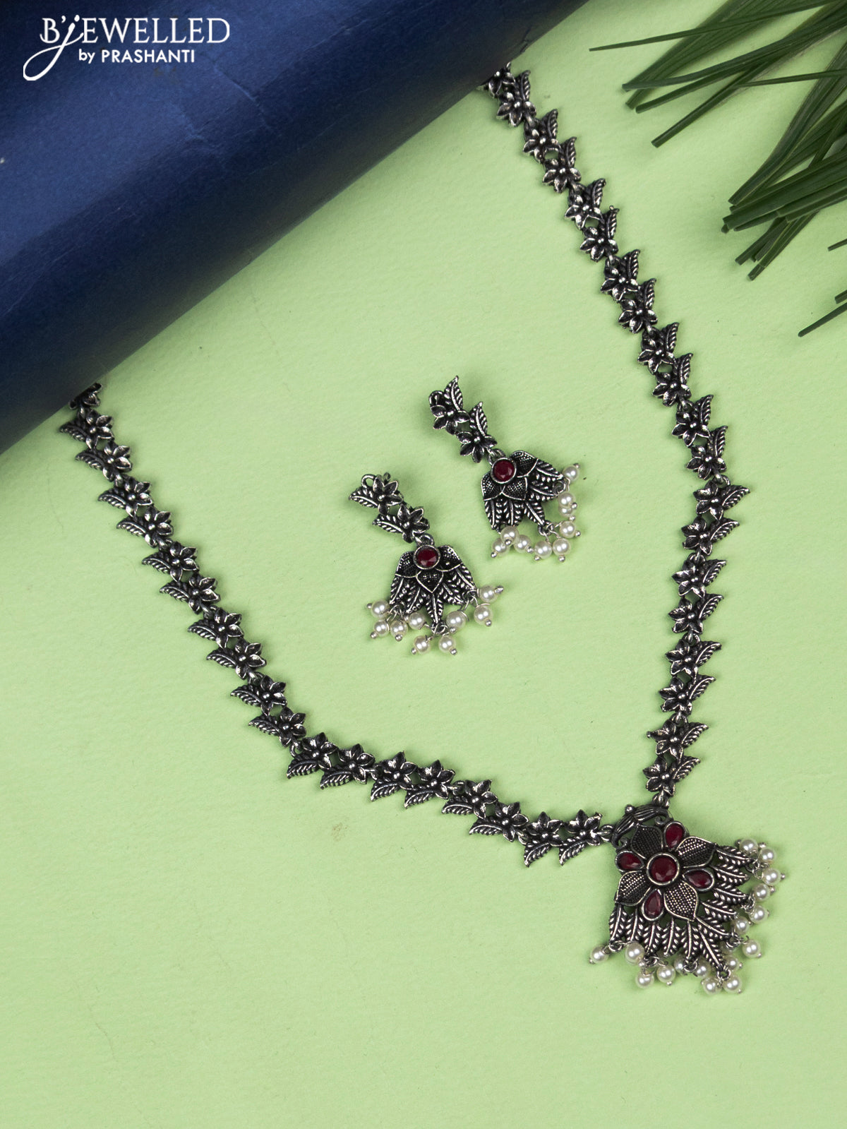 Oxidised necklace floral design with ruby stones and pearl hangings