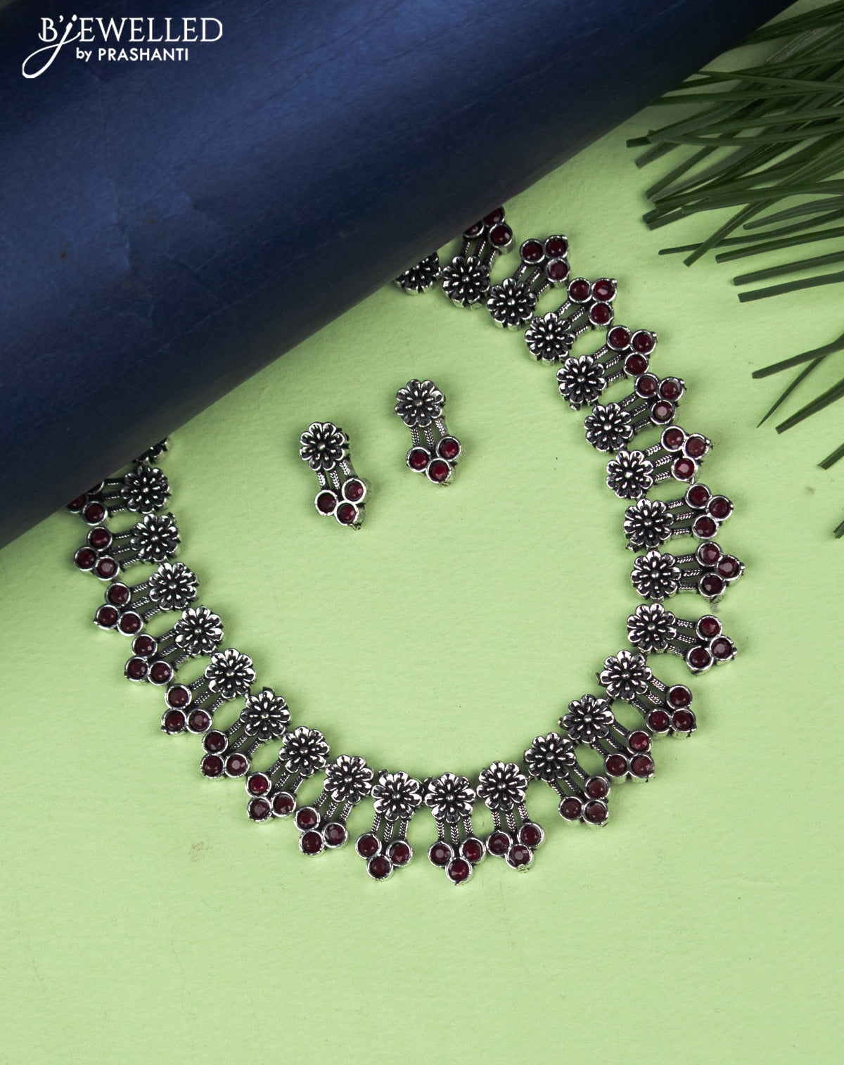 Oxidised necklace floral design with ruby stones