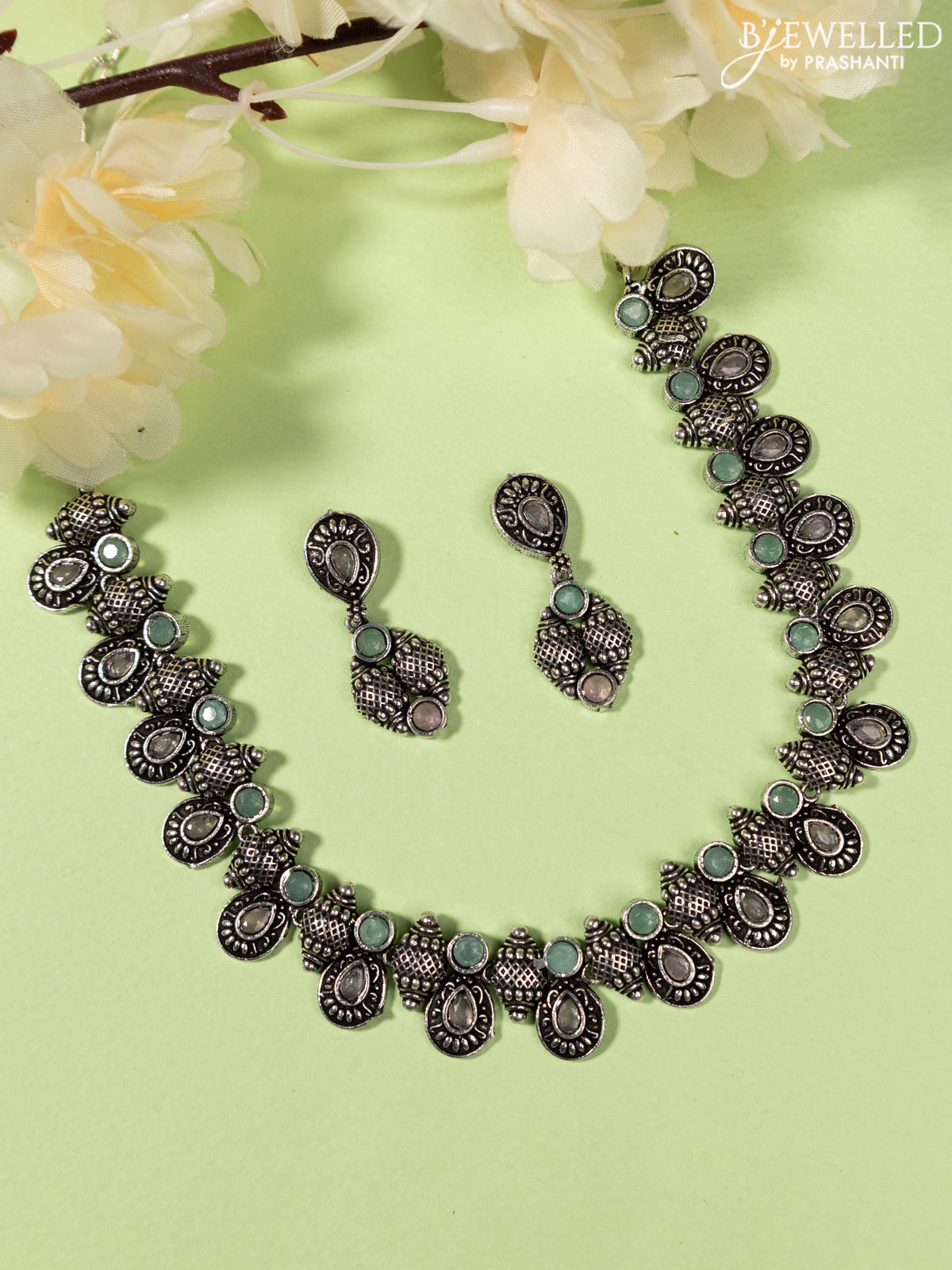 Oxidised Necklace with baby pink and mint green stones