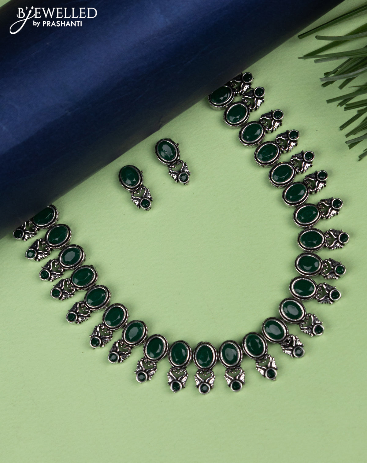 Oxidised necklace with emerald stones