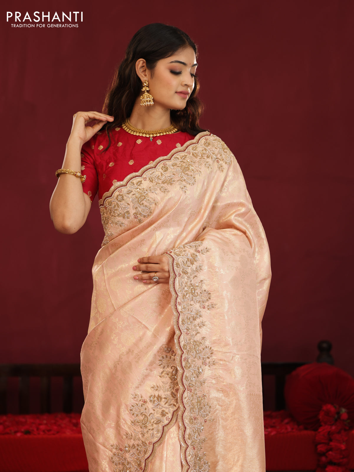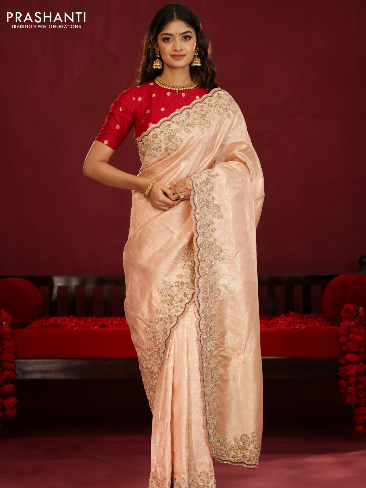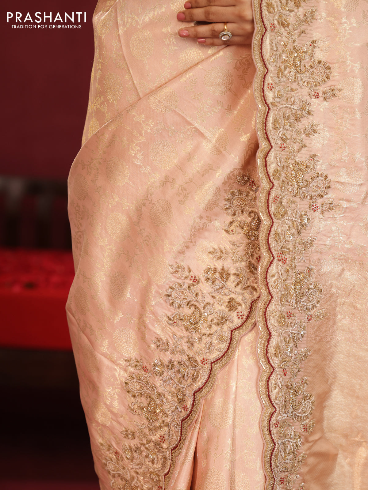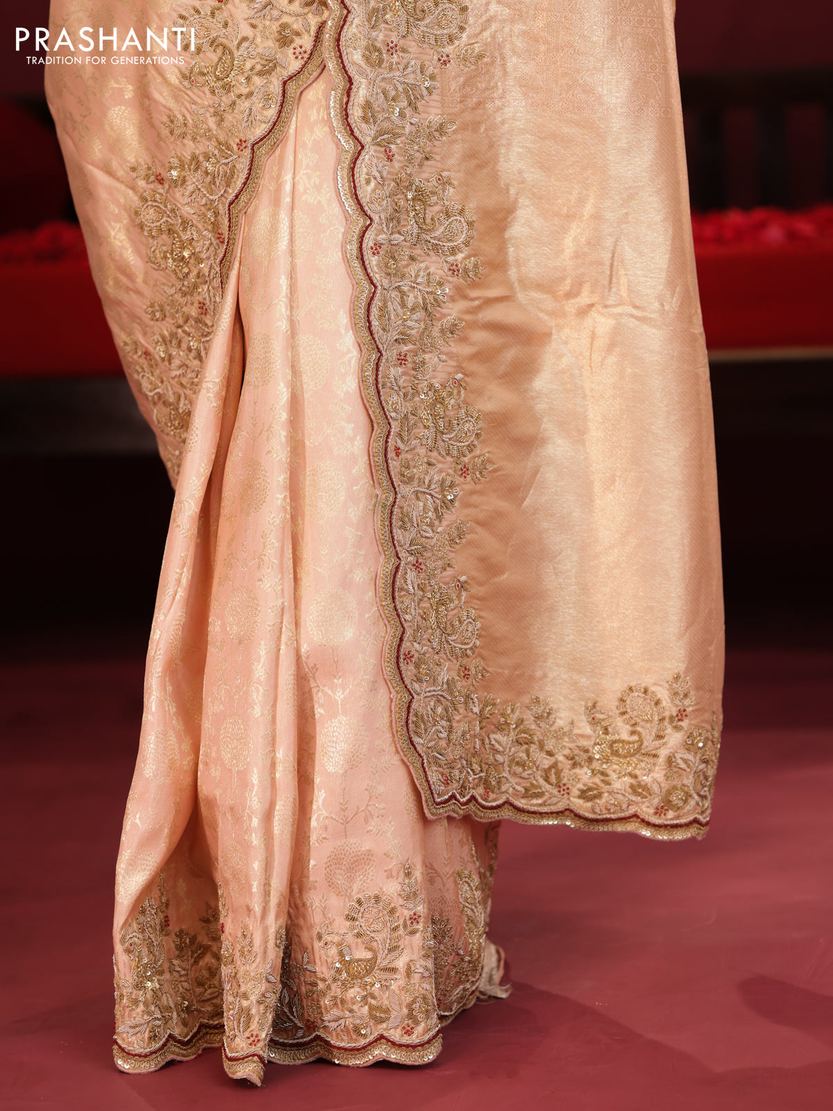Pastel pink pure kanchipuram silk saree with allover weaves & border embroidery