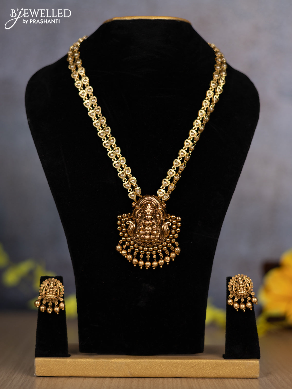 Pearl double layer haram with lakshmi pendant and golden beads hanging