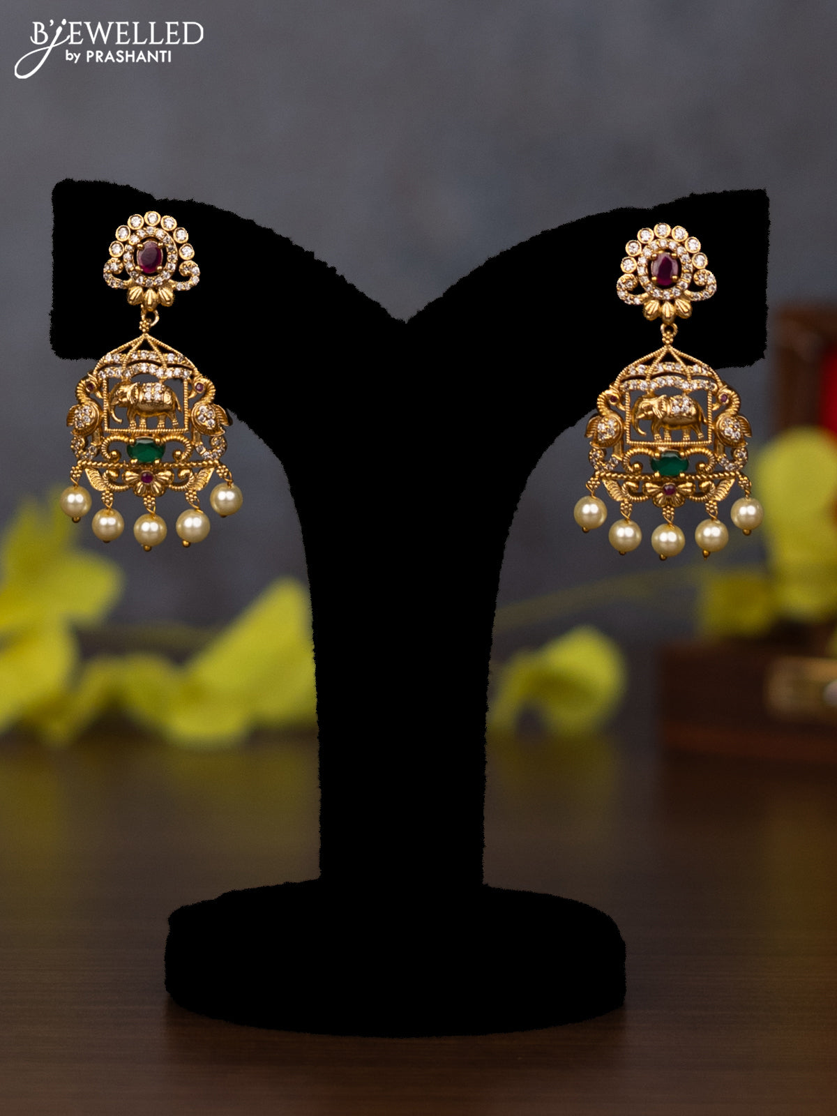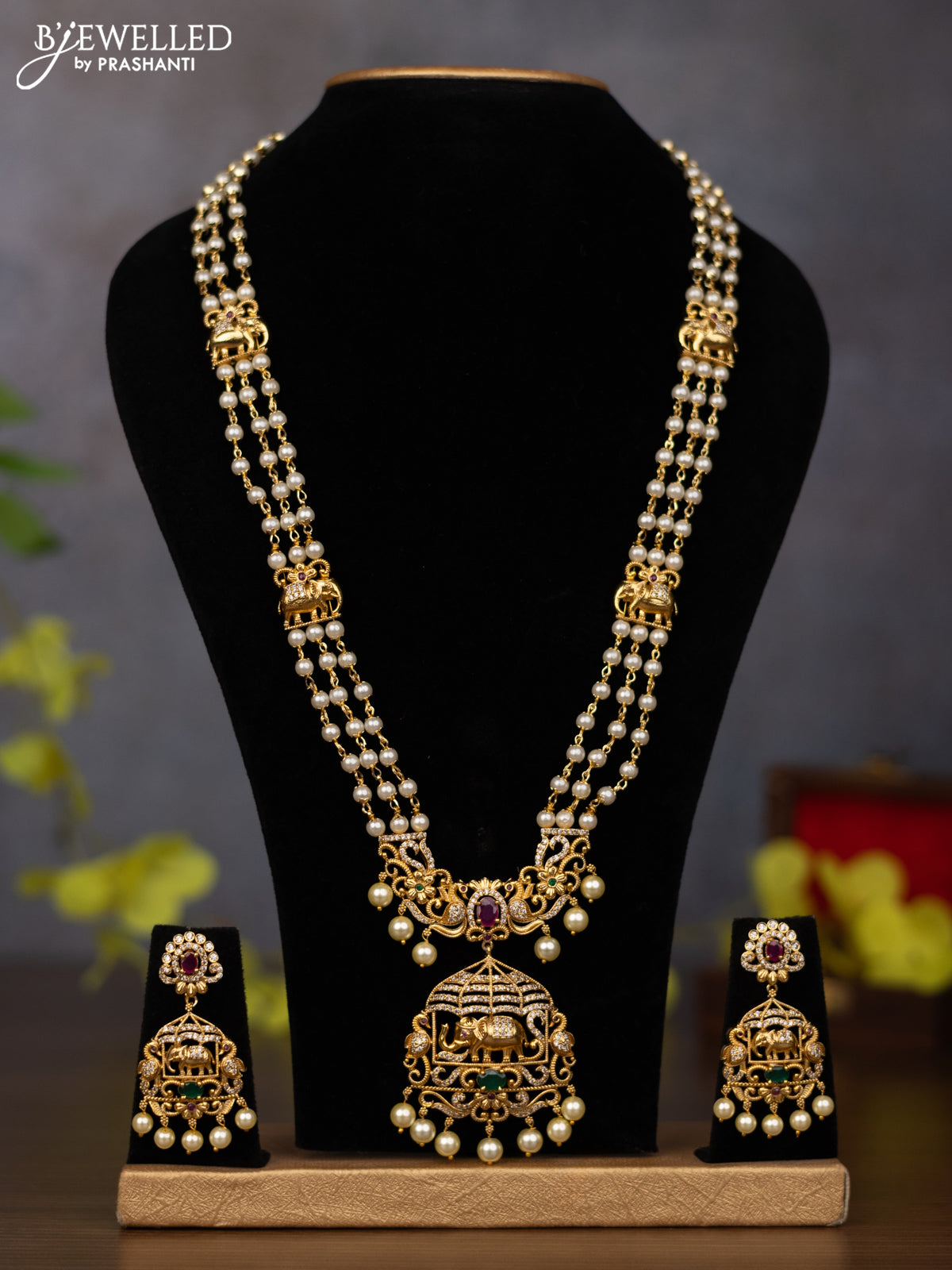 Pearl haaram elephant design with kemp & cz stones and pearl hangings