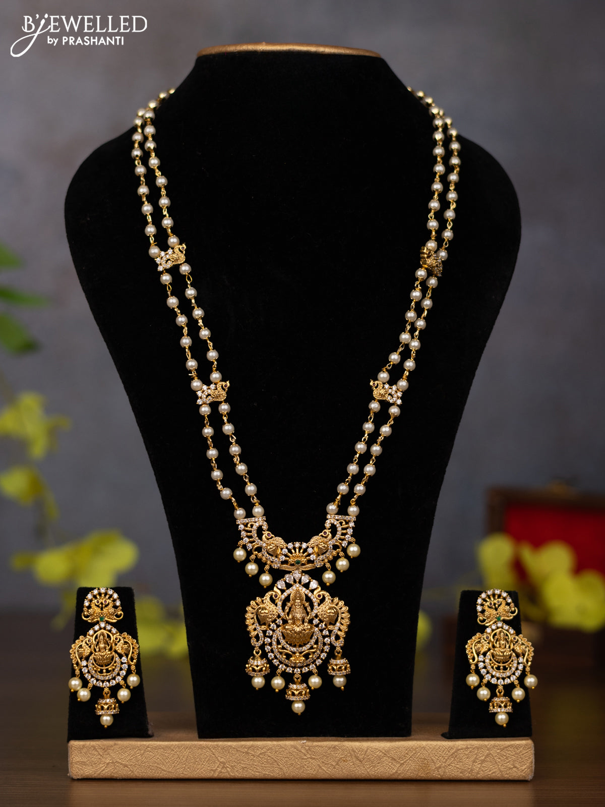 Pearl haaram lakshmi pendant with kemp & cz stones and pearl hangings