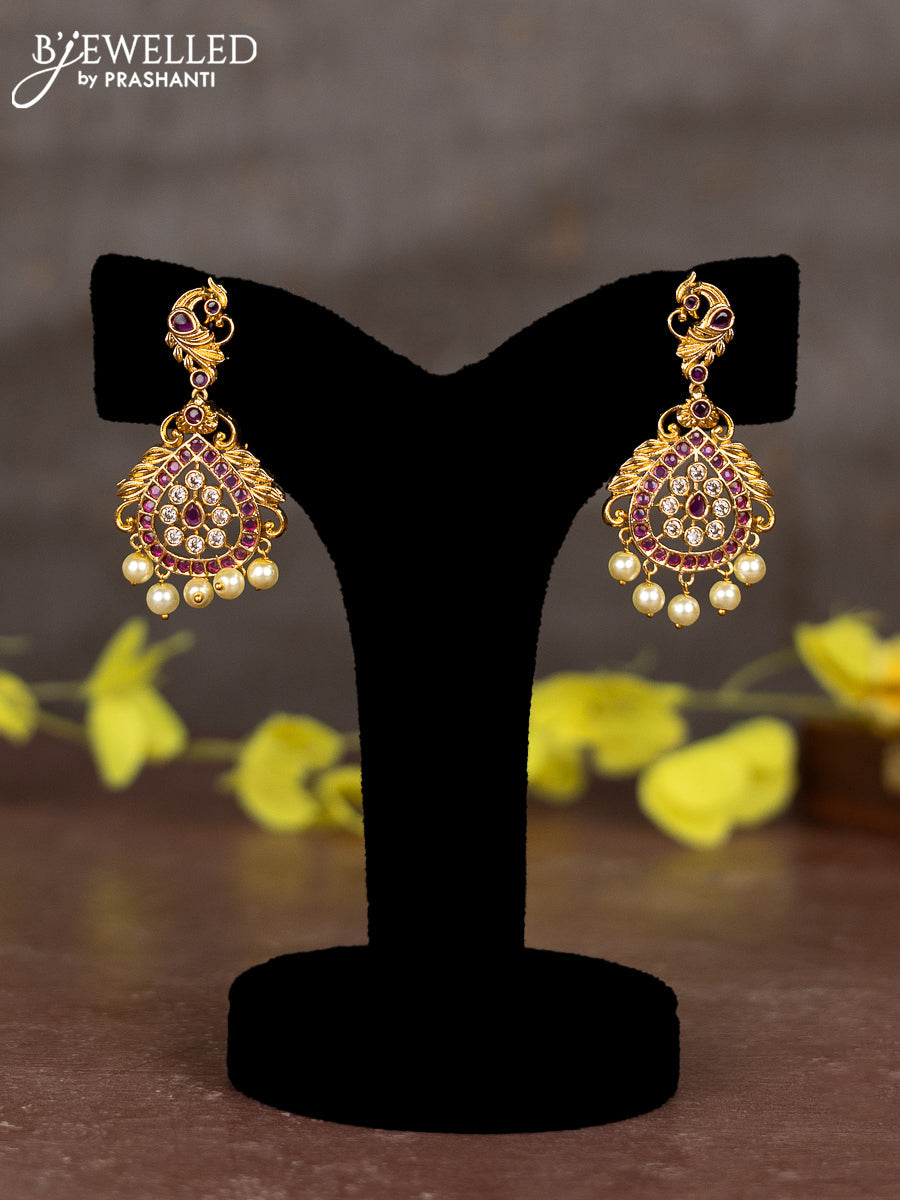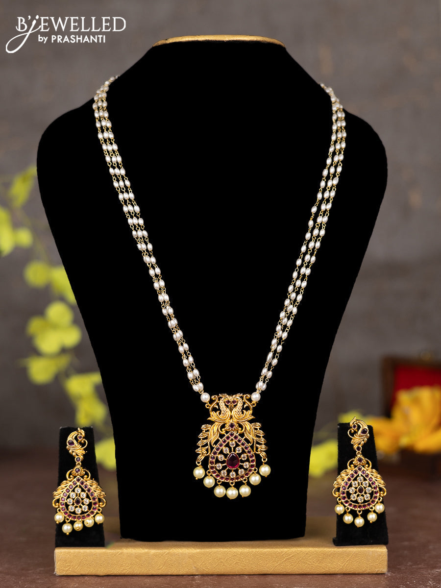 Pearl necklace double peacock design with ruby & cz stones and pearl hangings