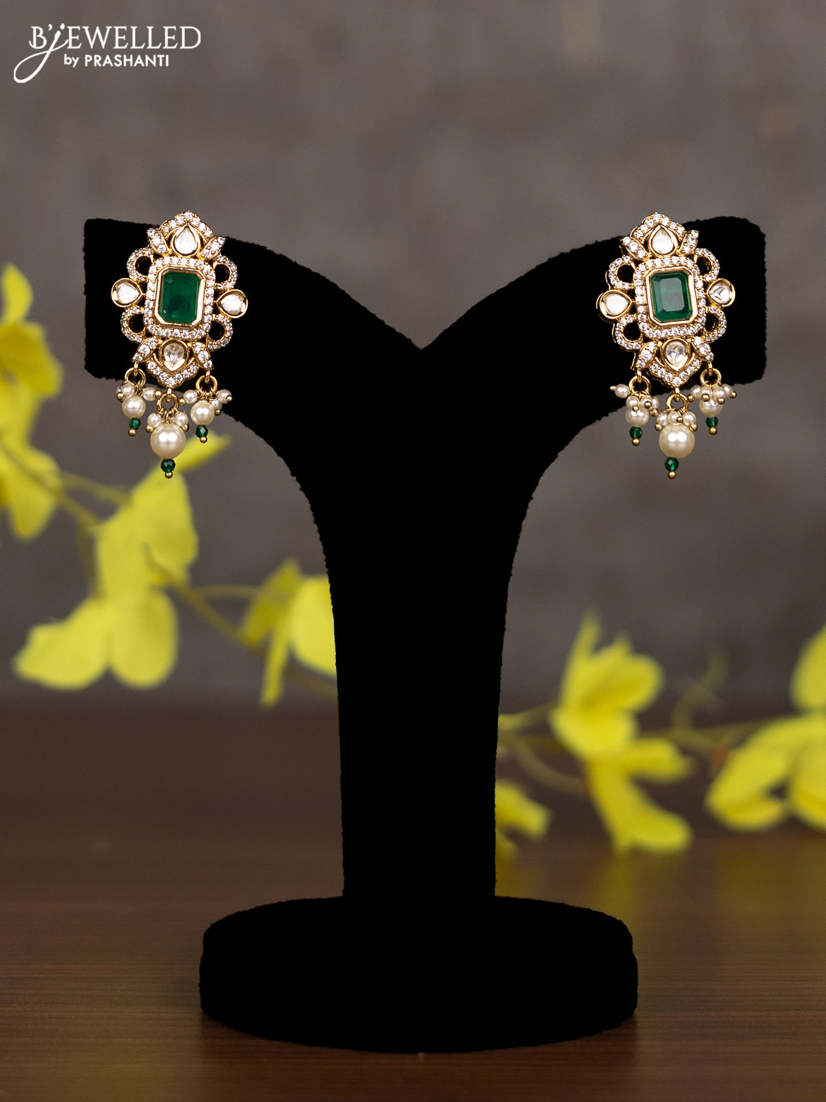 Pearl necklace with emerald & cz kundan stones and pearl hangings