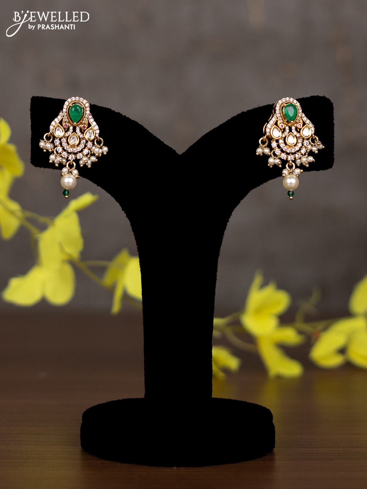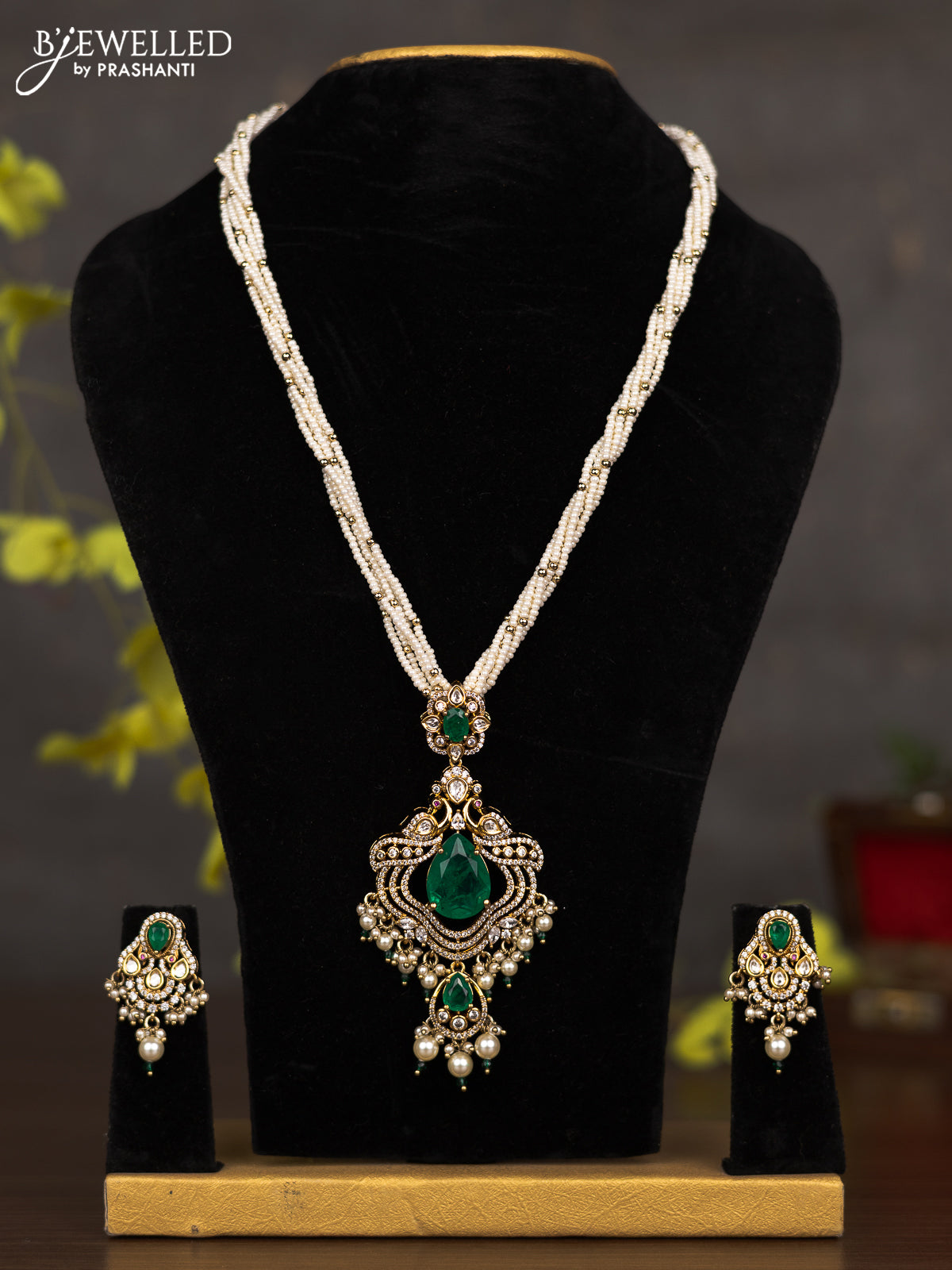 Pearl necklace with emerald & cz kundan stones and pearl hangings