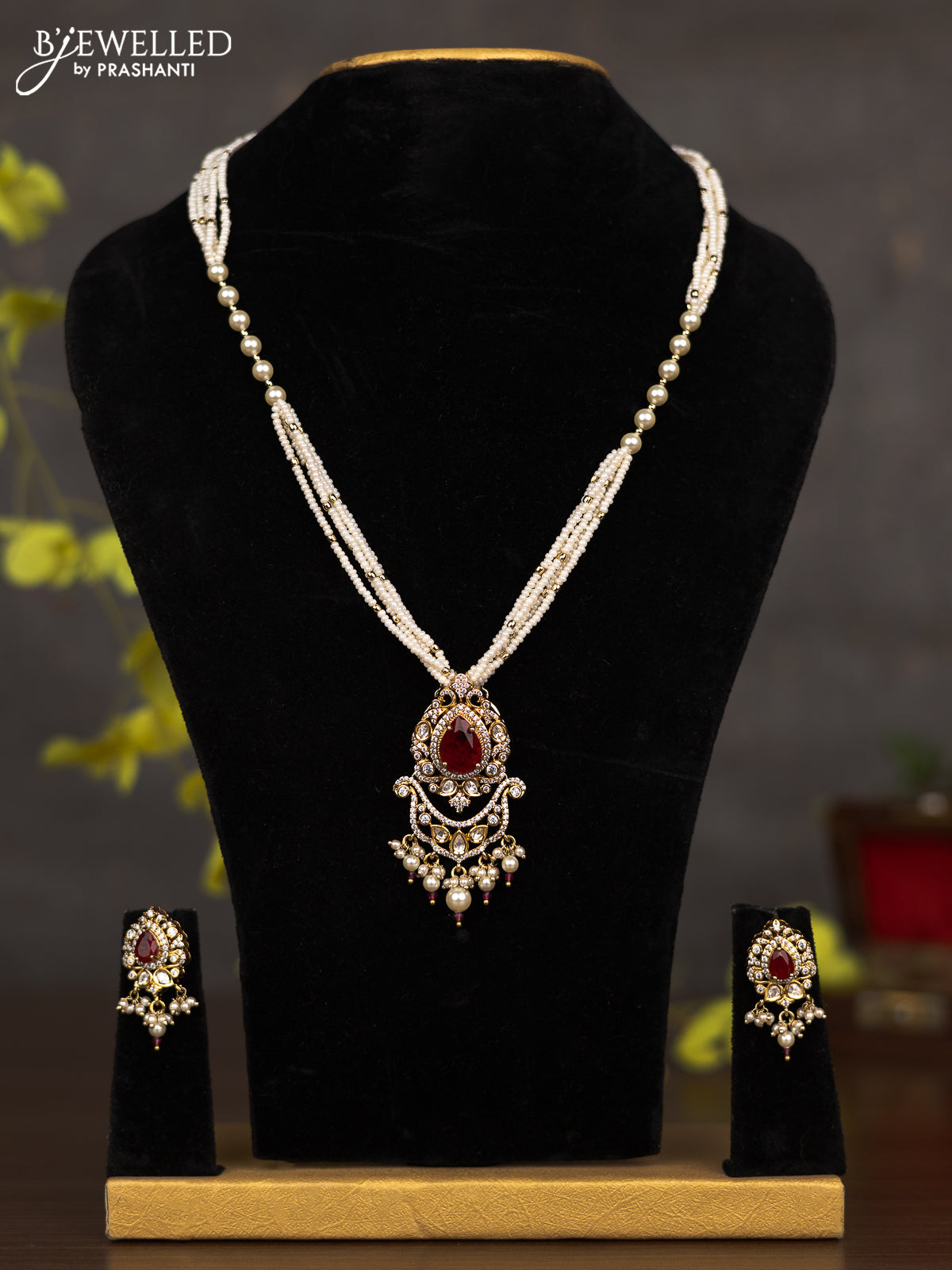 Pearl necklace with ruby & cz kundan stones and pearl hangings