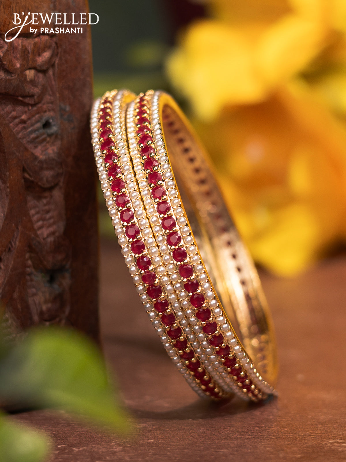 Pearl bangles with ruby stones and pearls in gold finish