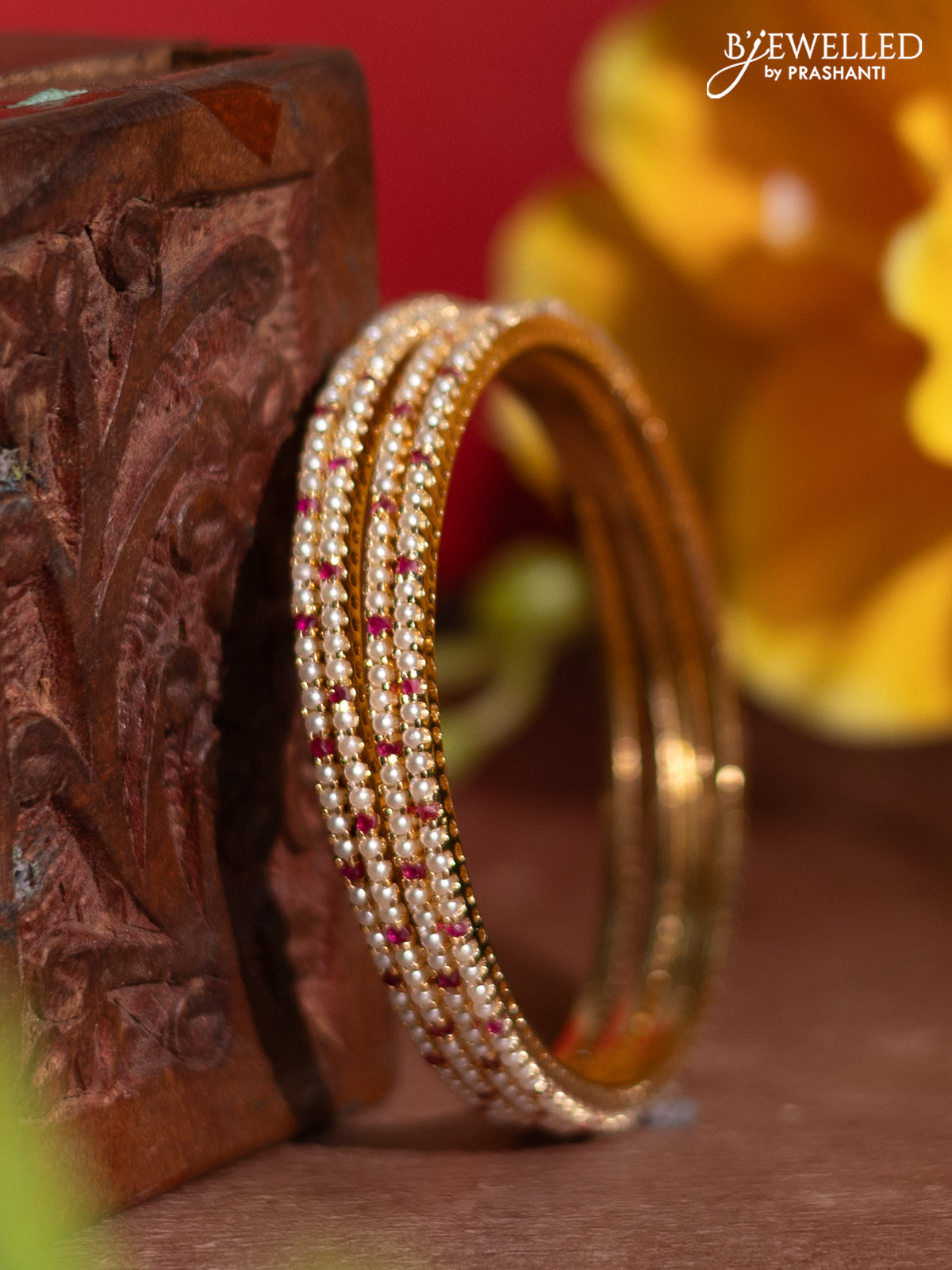 Pearl rajawadi bangles with ruby stones and pearls in gold finish