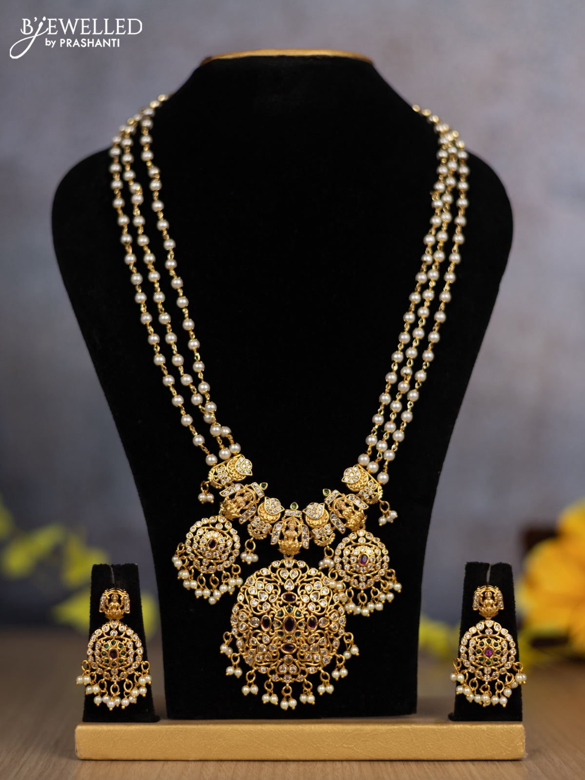 Pearl triple layer haram lakshmi design with kemp & cz stones and pearl hanging