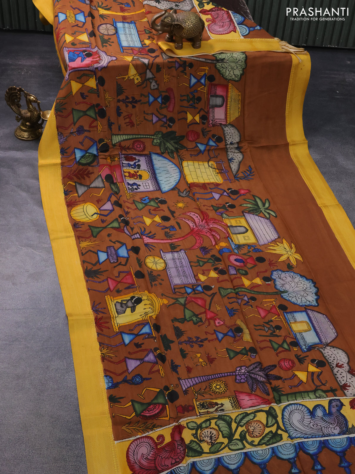 Pen kalamkari dupatta brown and mustard yellow with allover kalamkari prints and zari woven border