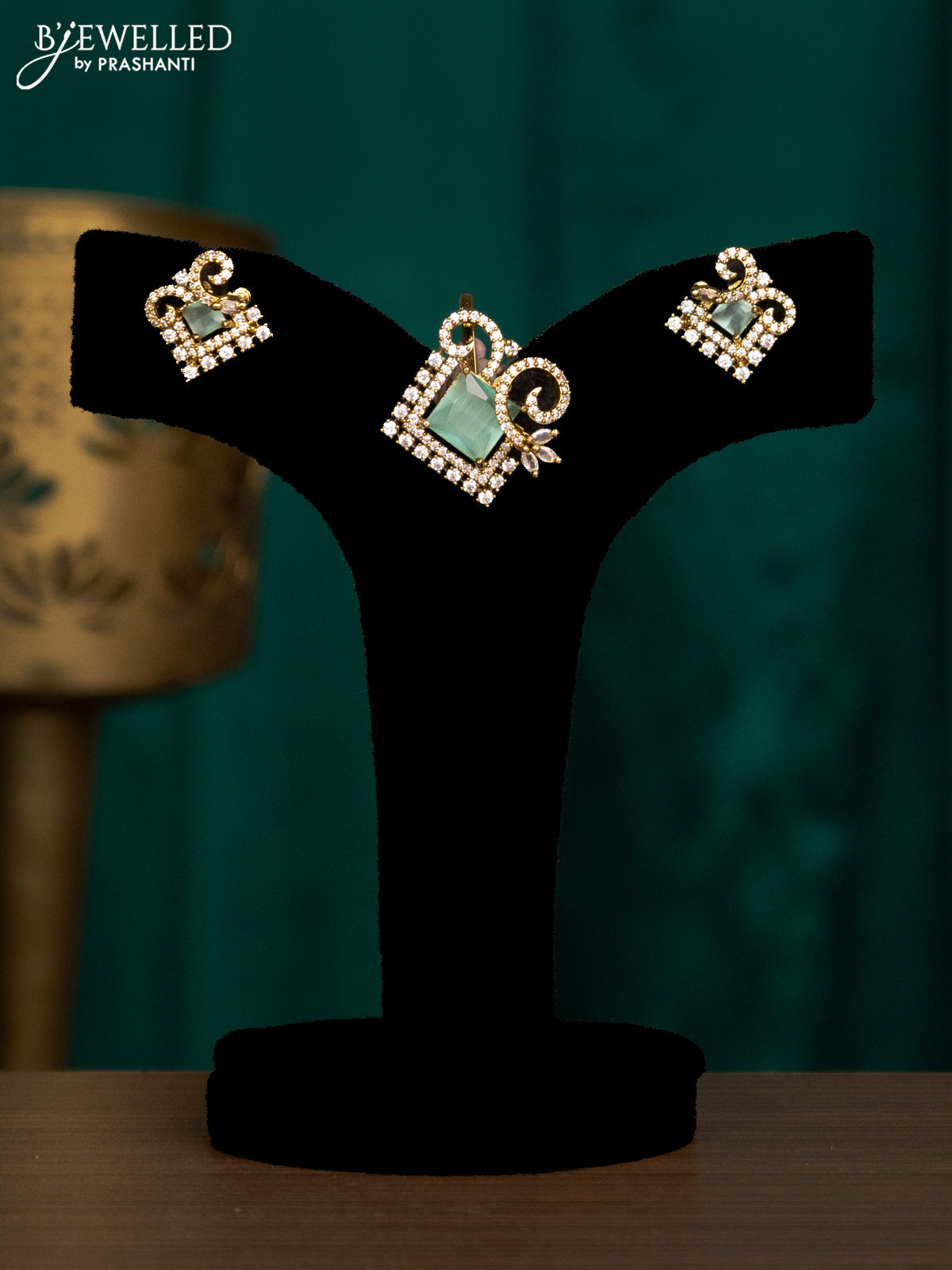 Pendant set with mint green and cz stones in victorian finish