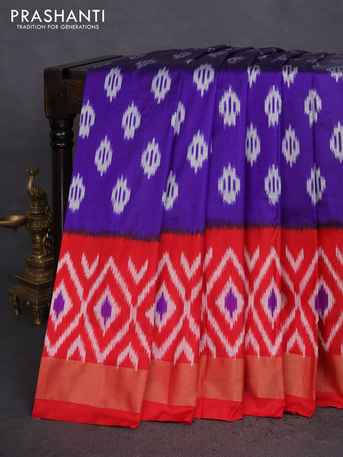 Pochampally silk saree blue and red with allover ikat butta weaves and ikat woven zari border
