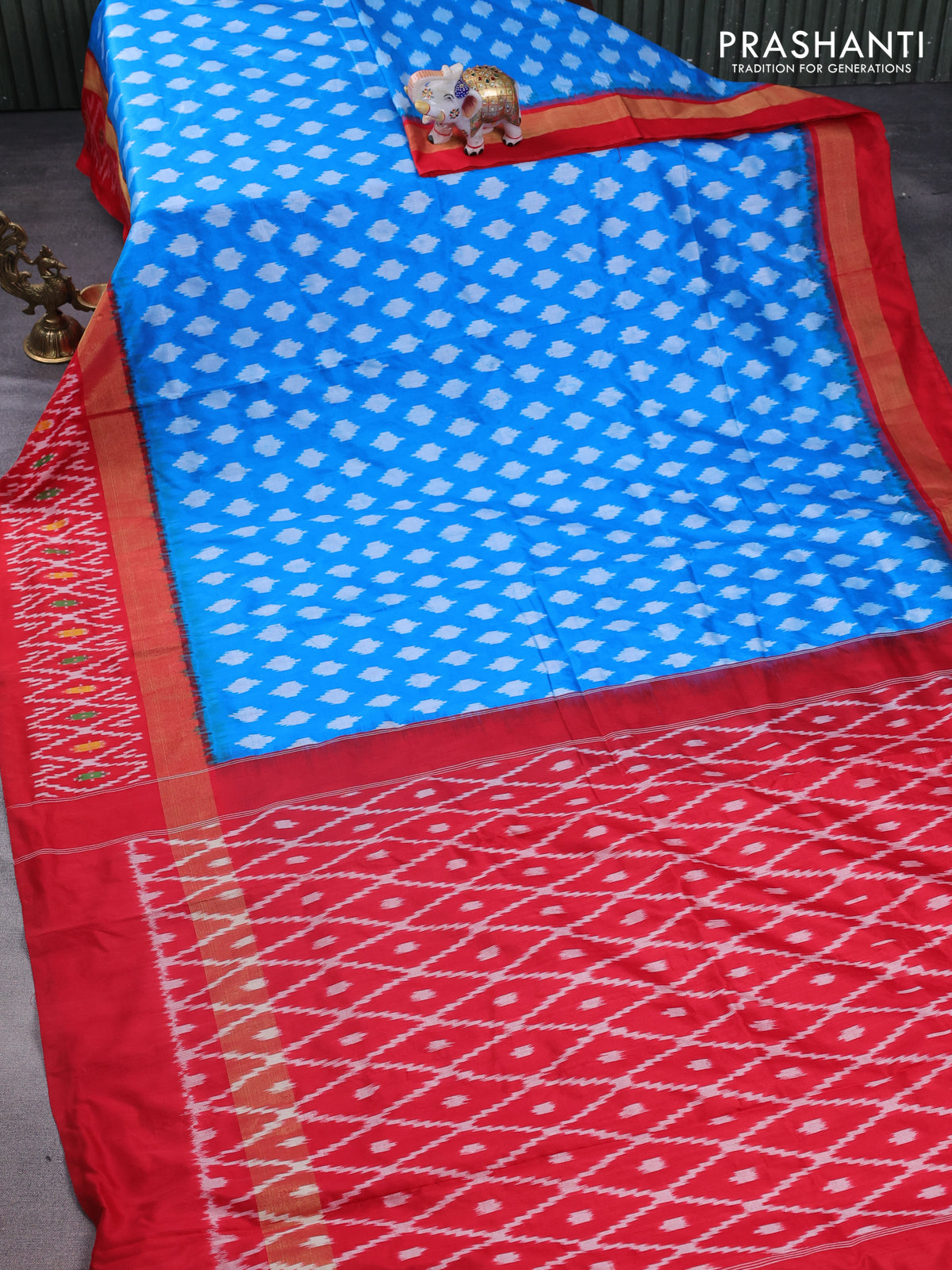 Pochampally silk saree cs blue and red with allover ikat butta weaves and long zari woven ikat border