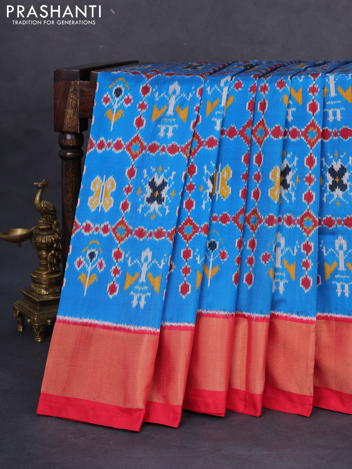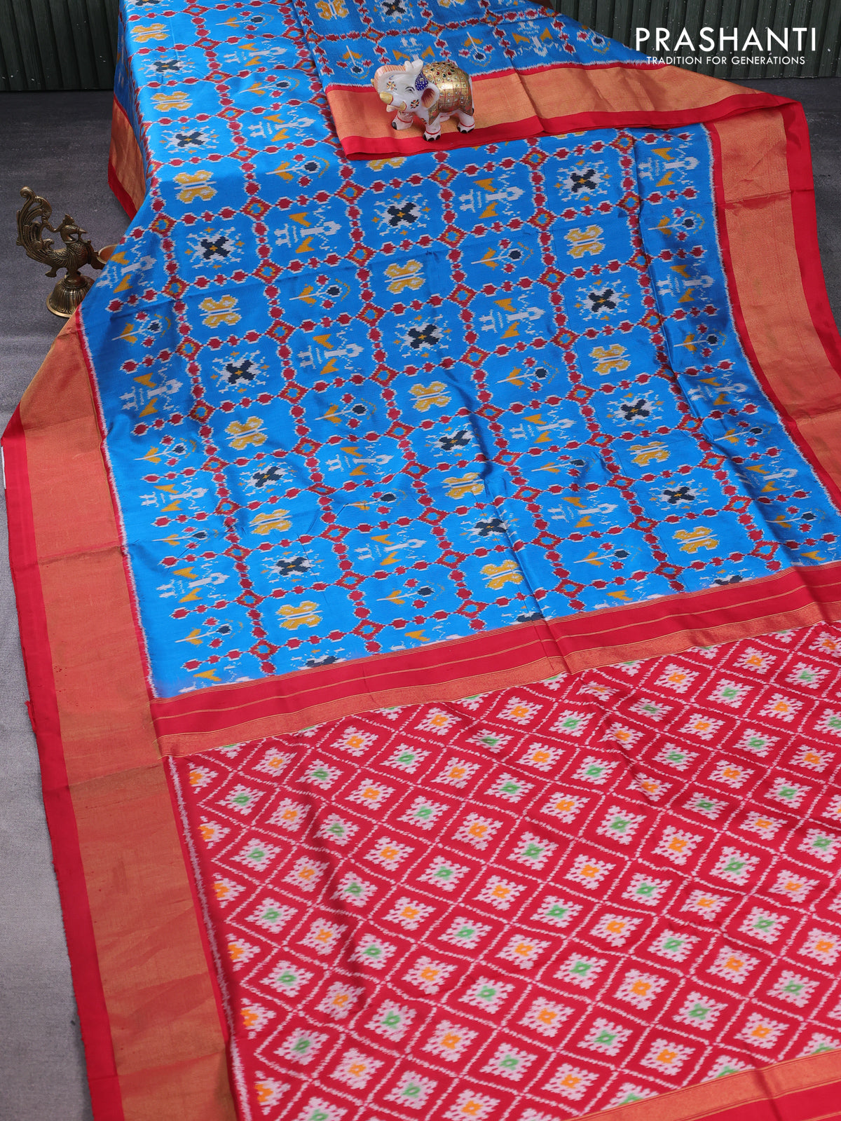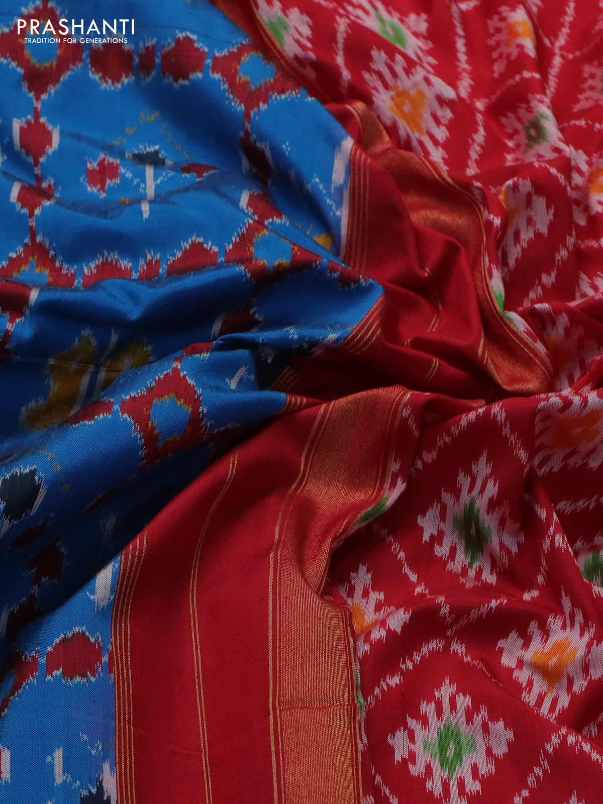 Pochampally silk saree cs blue and red with allover ikat weaves and zari woven border