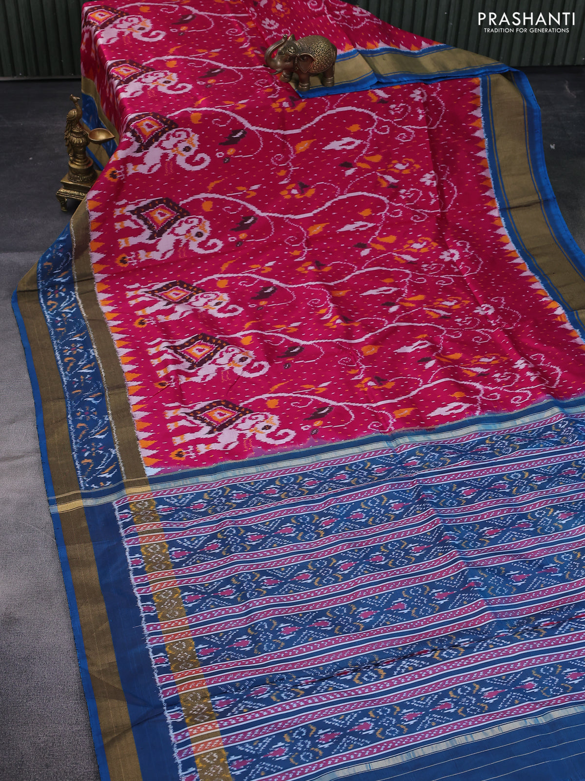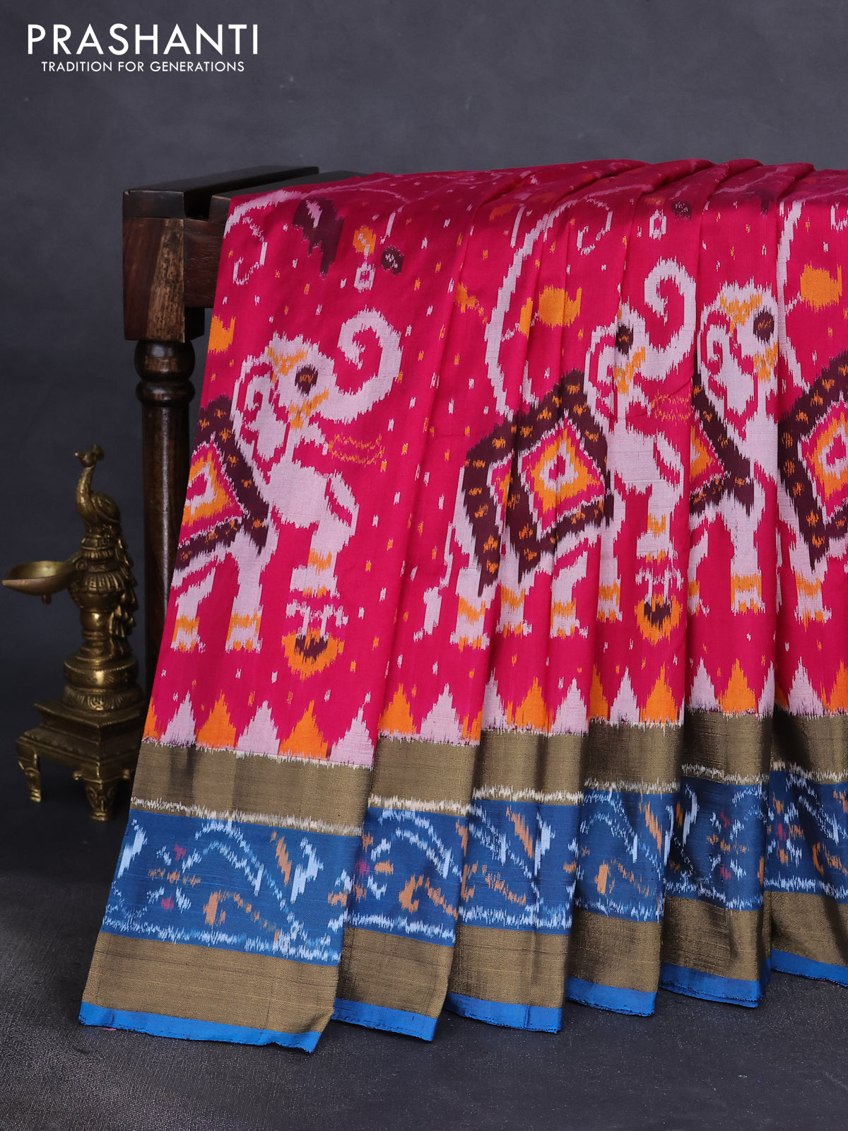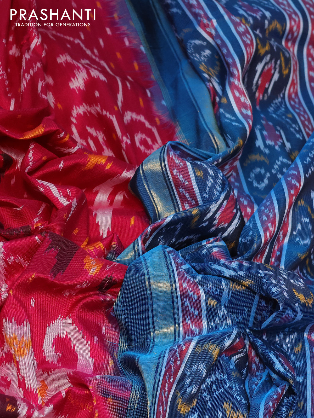 Pochampally silk saree dark pink and cs blue with allover ikat weaves and temple design ikat woven border