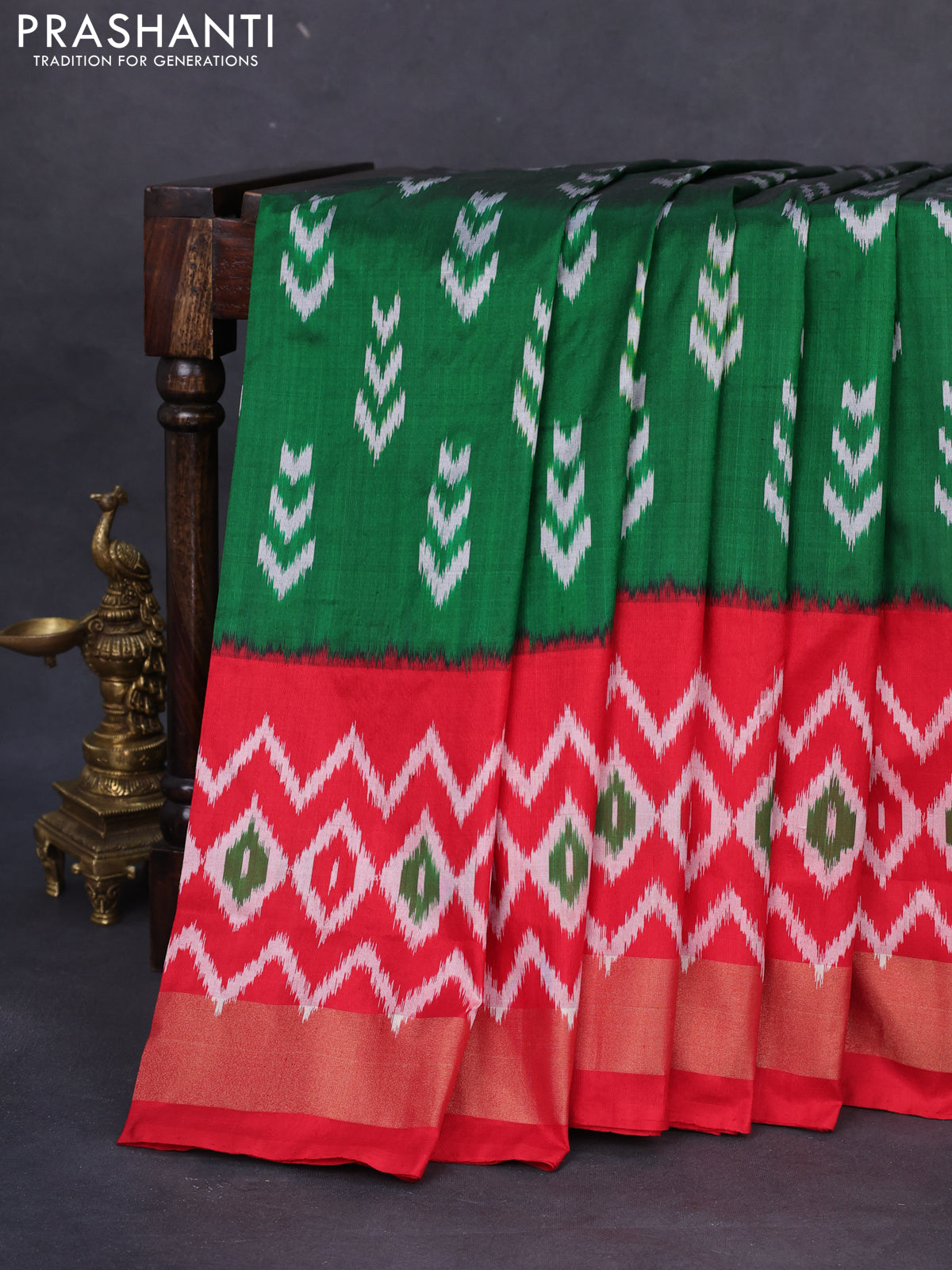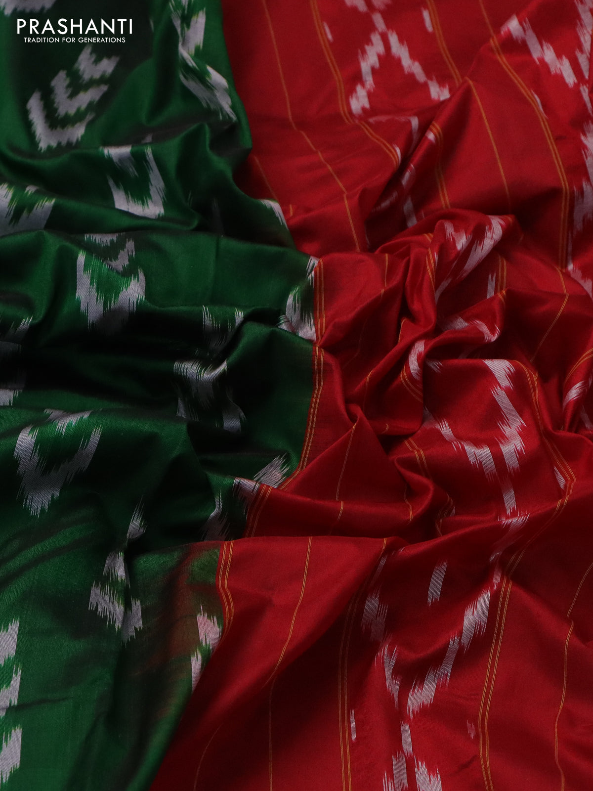 Pochampally silk saree green and red with allover ikat butta weaves and long ikat woven zari border