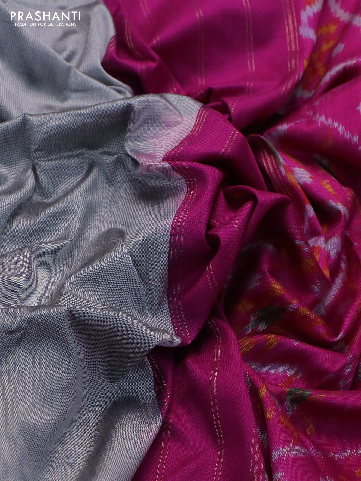 Pochampally silk saree grey and pink with plain body and temple design rettapet zari woven border