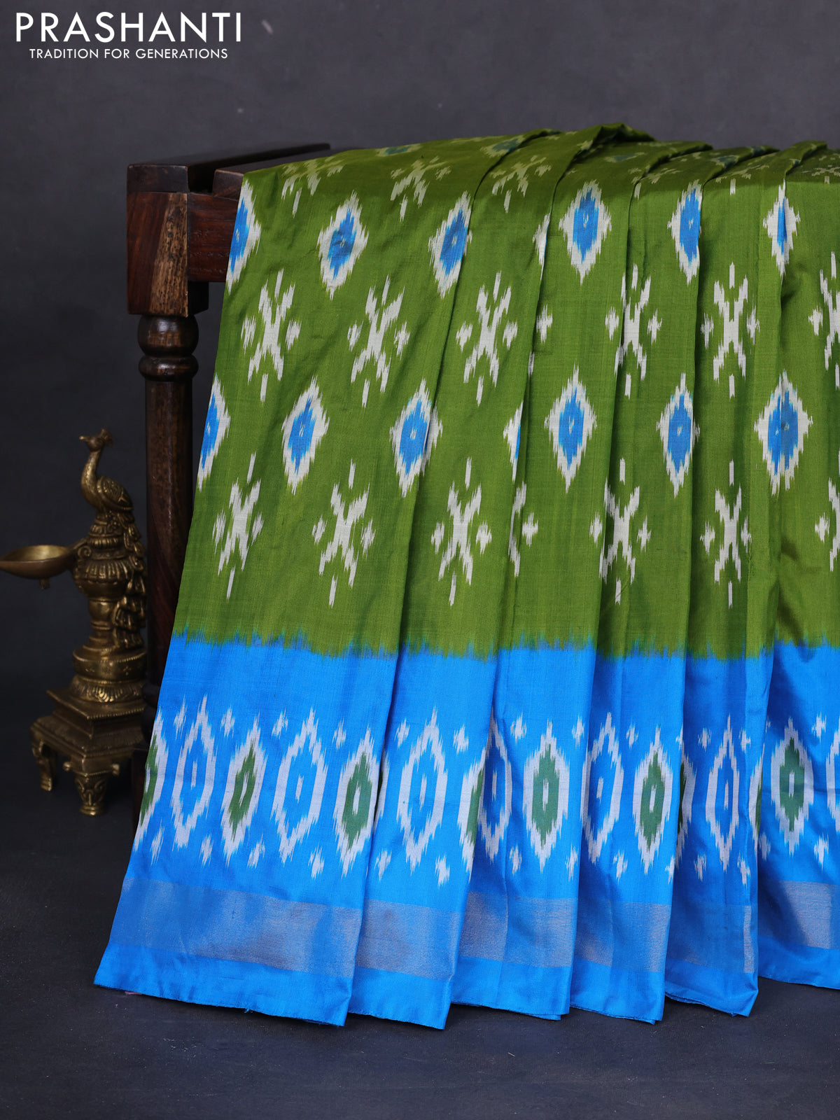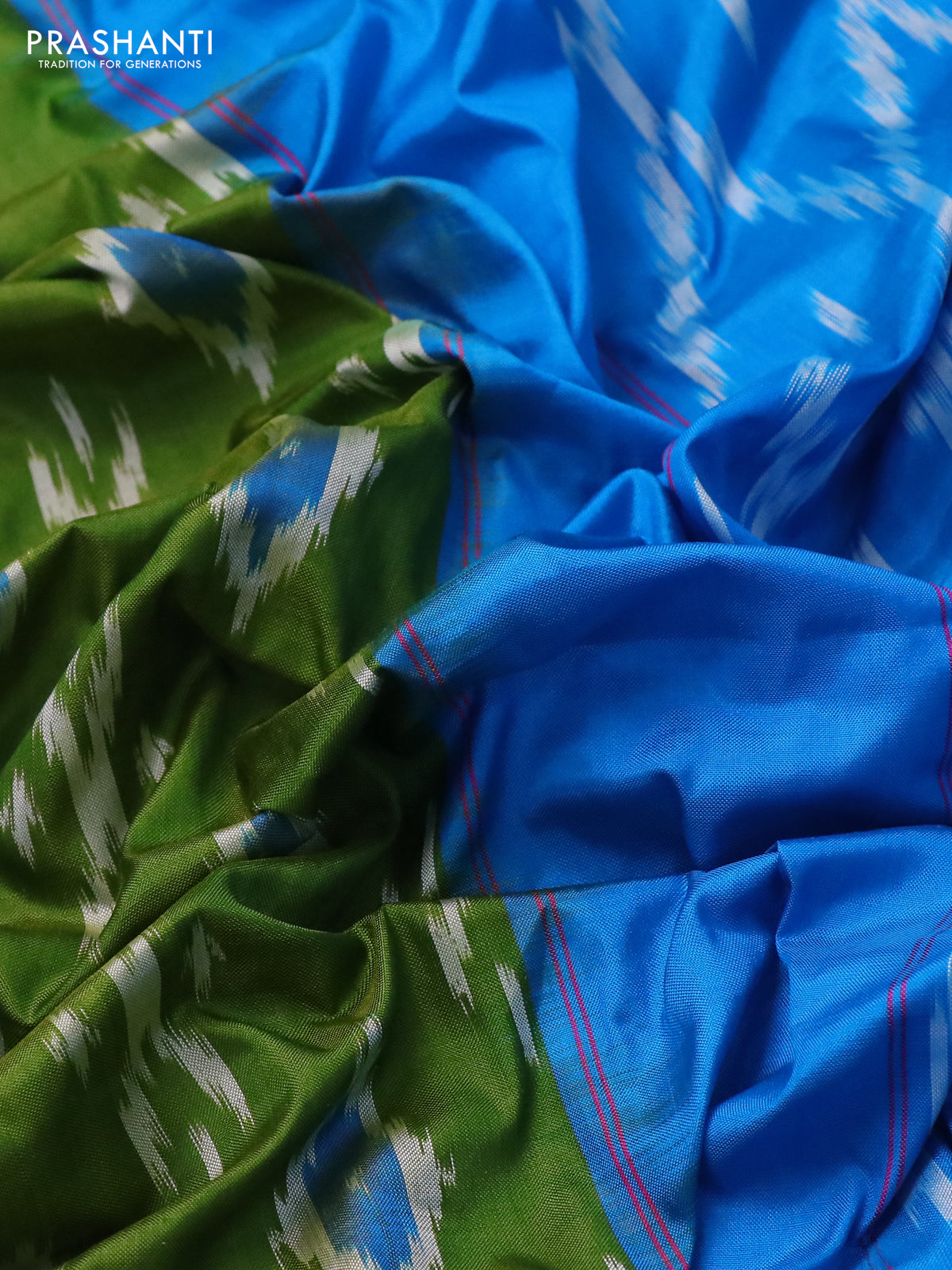 Pochampally silk saree light green and cs blue with allover ikat butta weaves and long ikat woven zari border
