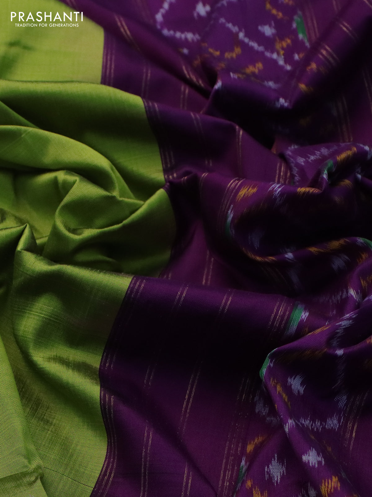 Pochampally silk saree light green and purple with plain body and temple design rettapet zari woven border