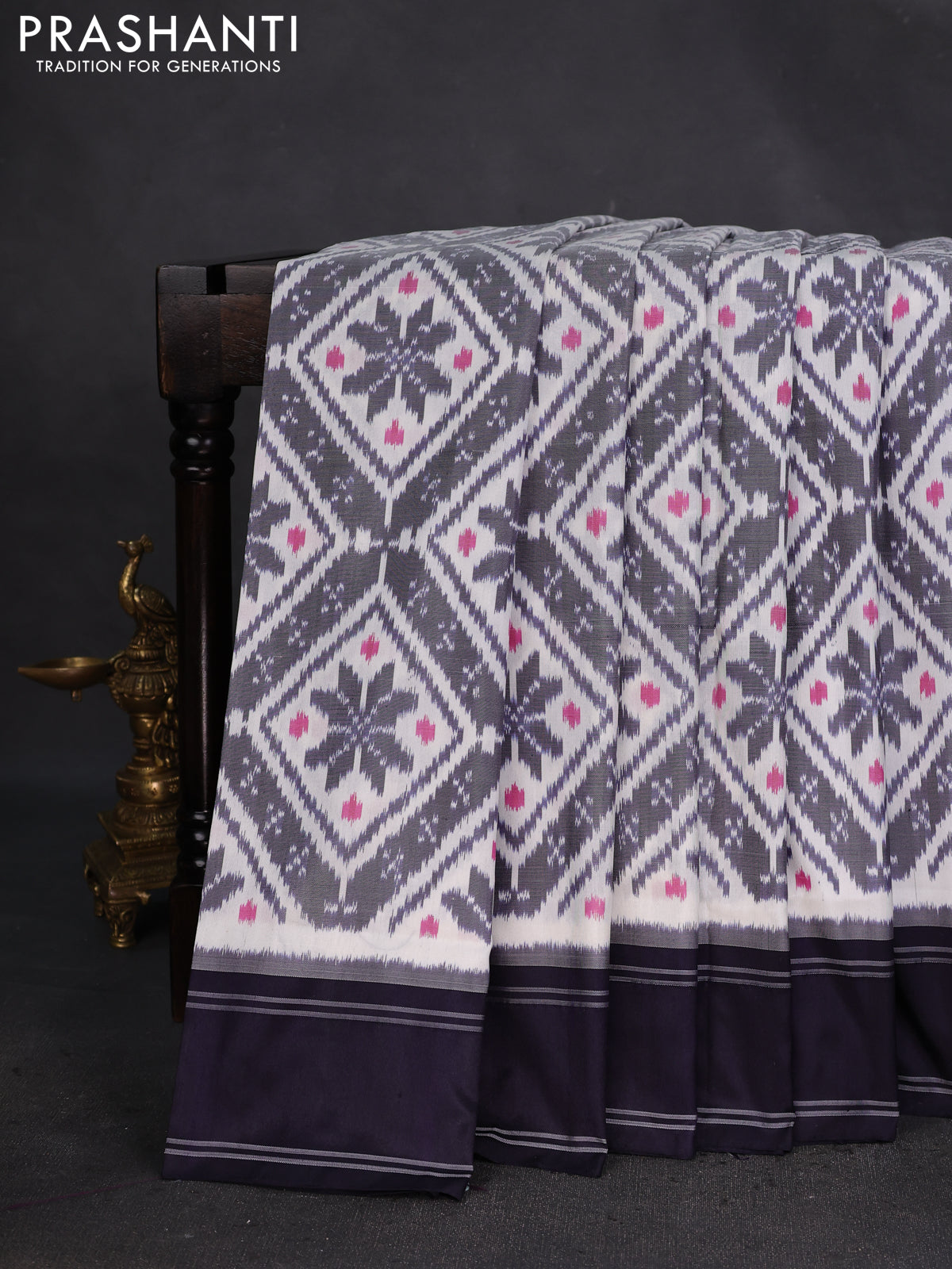 Pochampally silk saree off white and deep navy blue with allover ikat weaves and rettapet border