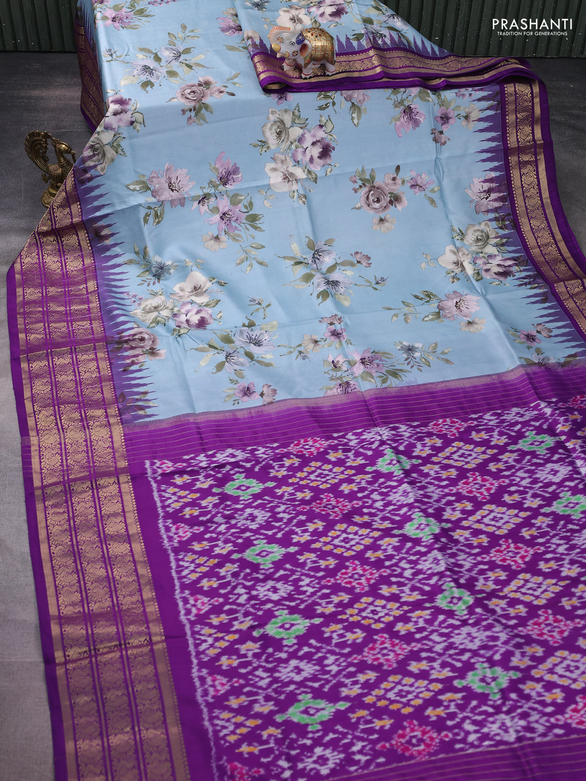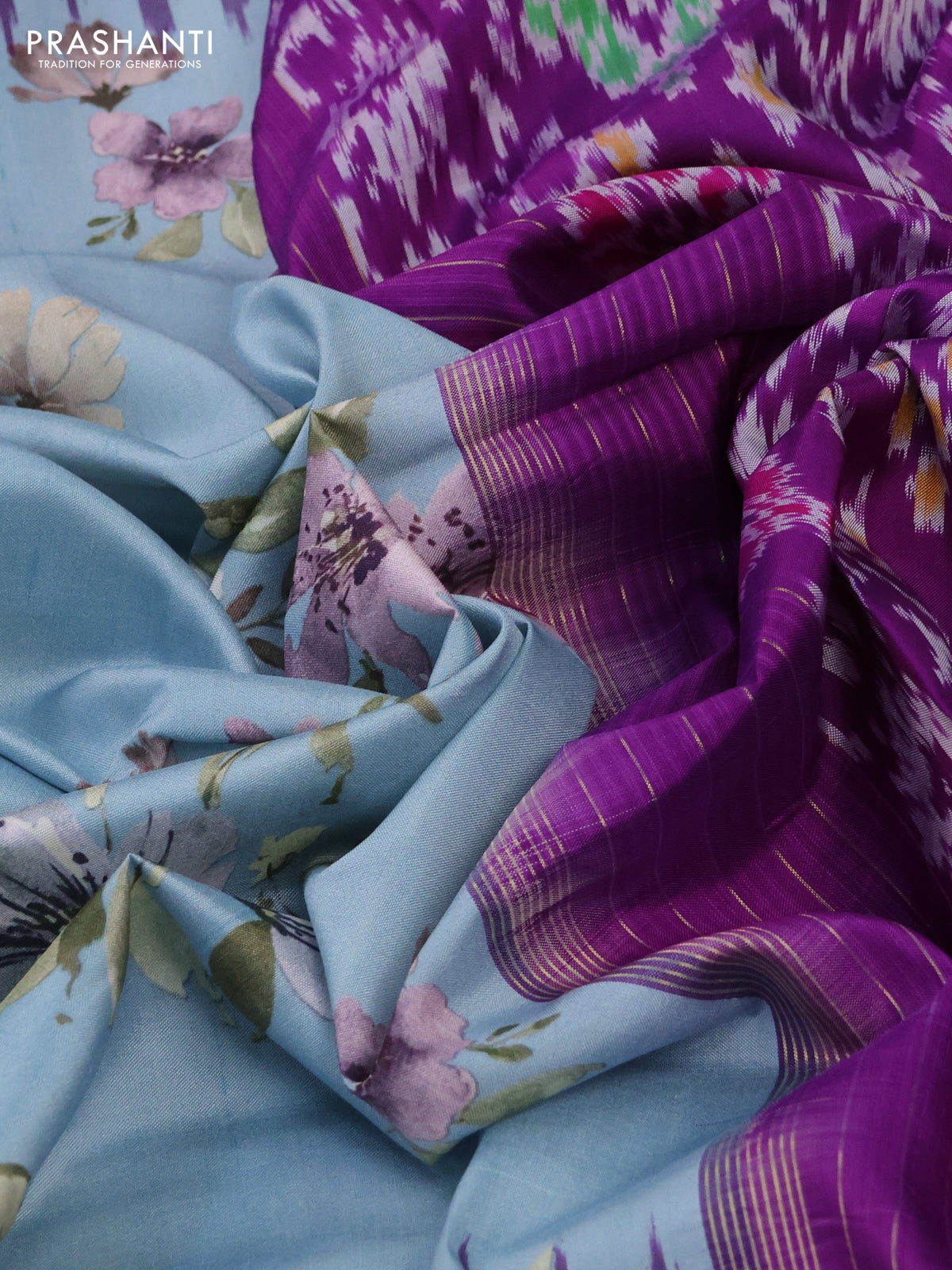 Pochampally silk saree pastel blue and purple with allover floral digital prints and temple design annam zari woven border