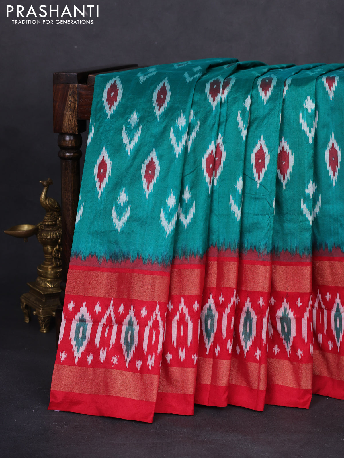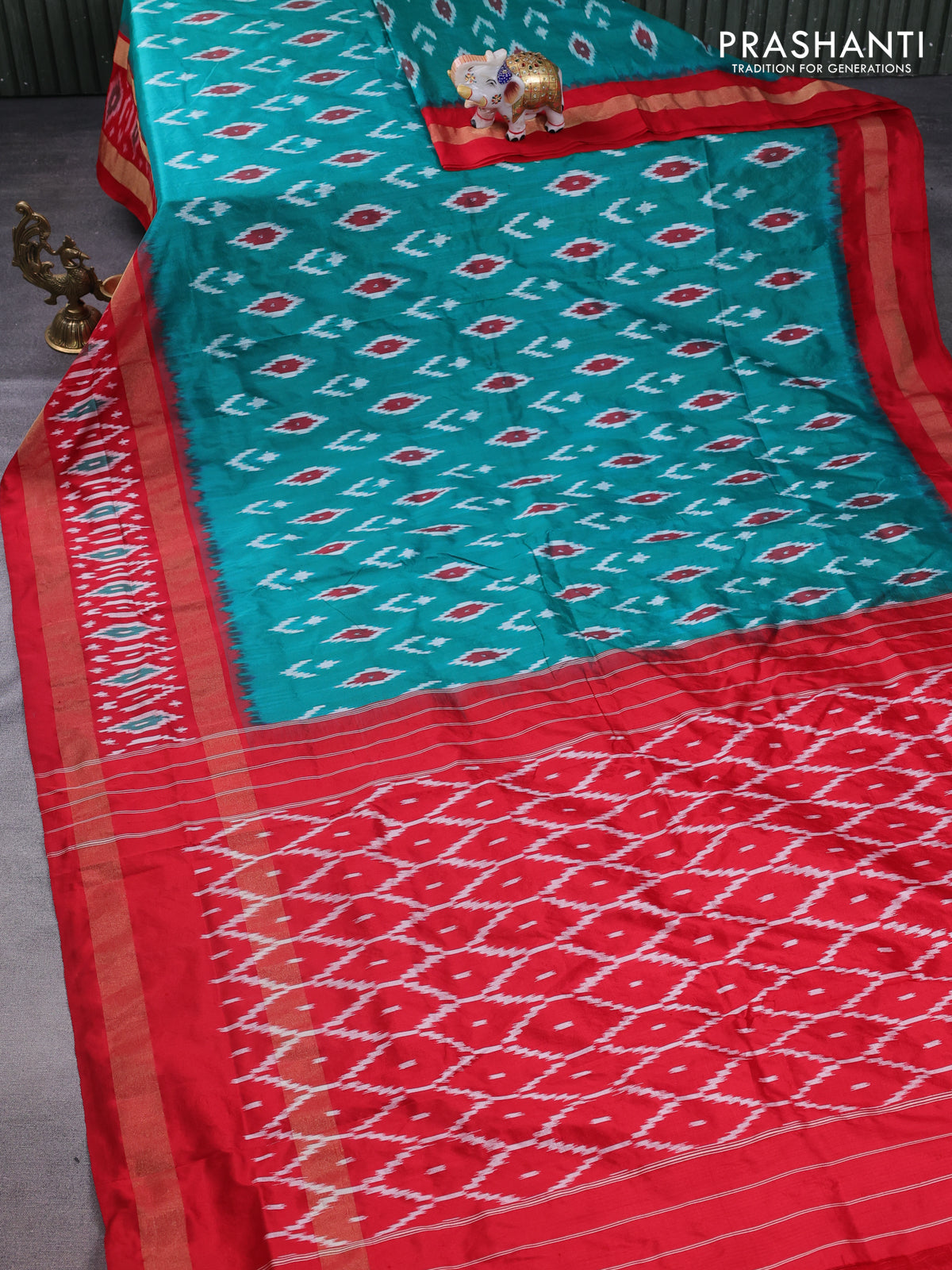 Pochampally silk saree teal green and red with allover ikat butta weaves and long zari woven ikat border
