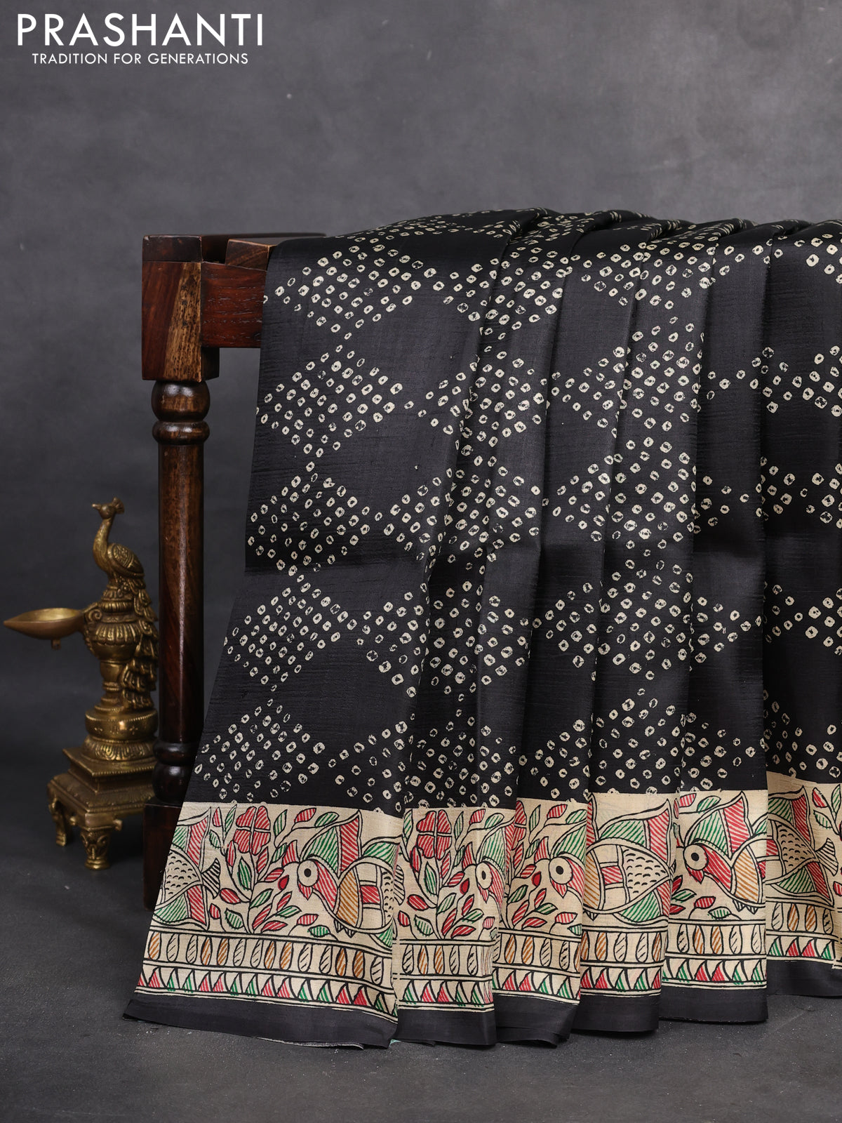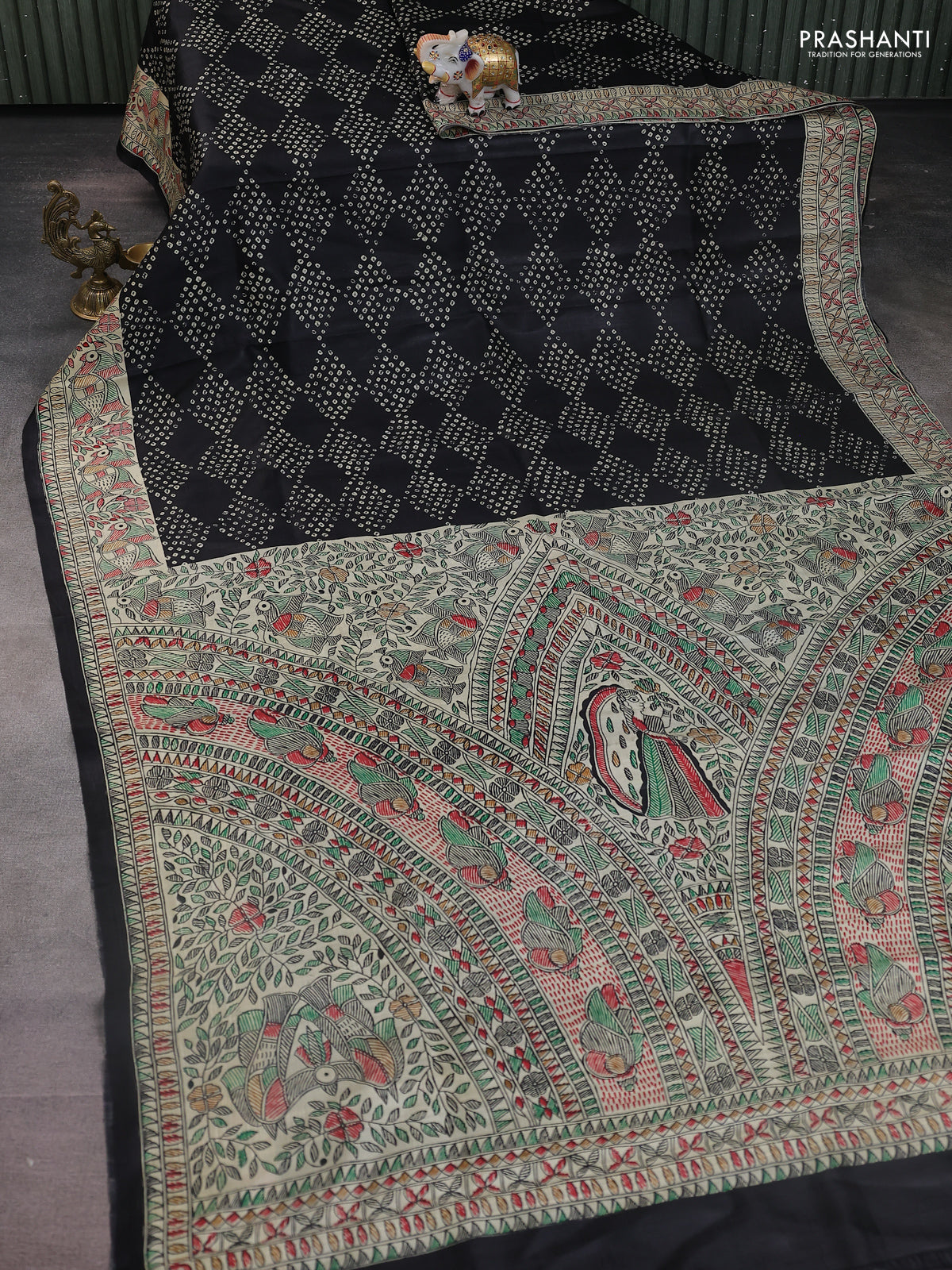 Printed silk saree black and cream with allover bandhani prints and madhubani printed pallu & border