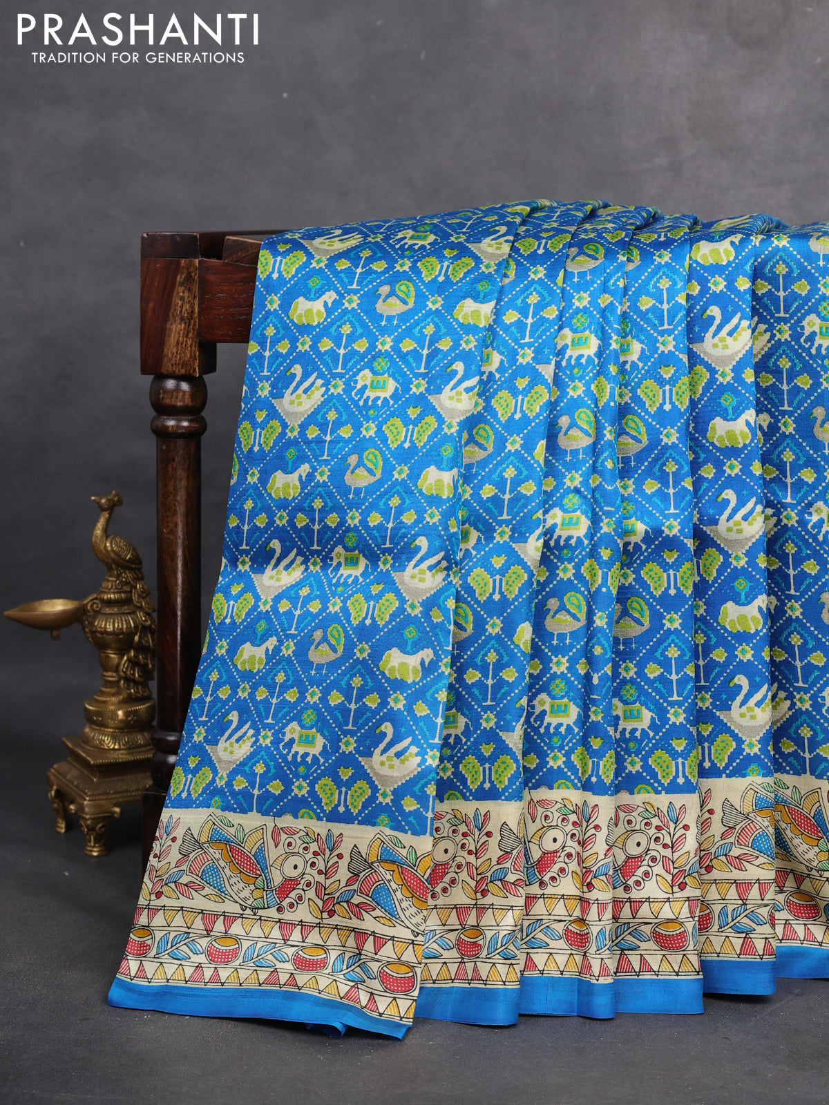 Printed silk saree blue and cream with allover patola prints and madhubani printed pallu & border