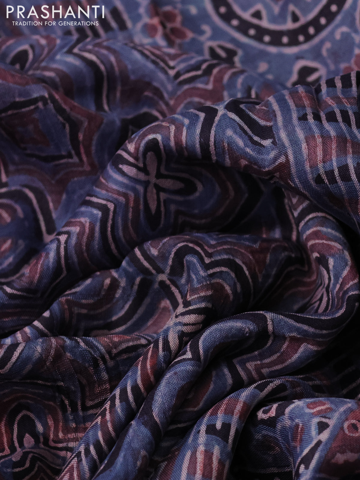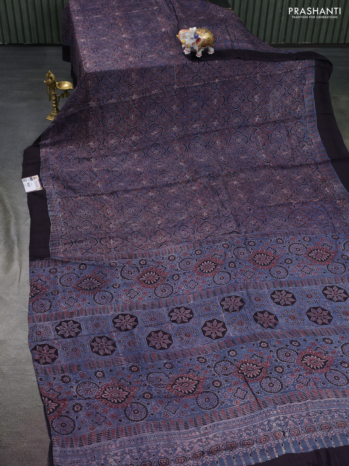 Printed silk saree bluish grey and black with allover ajrakh prints and simple border