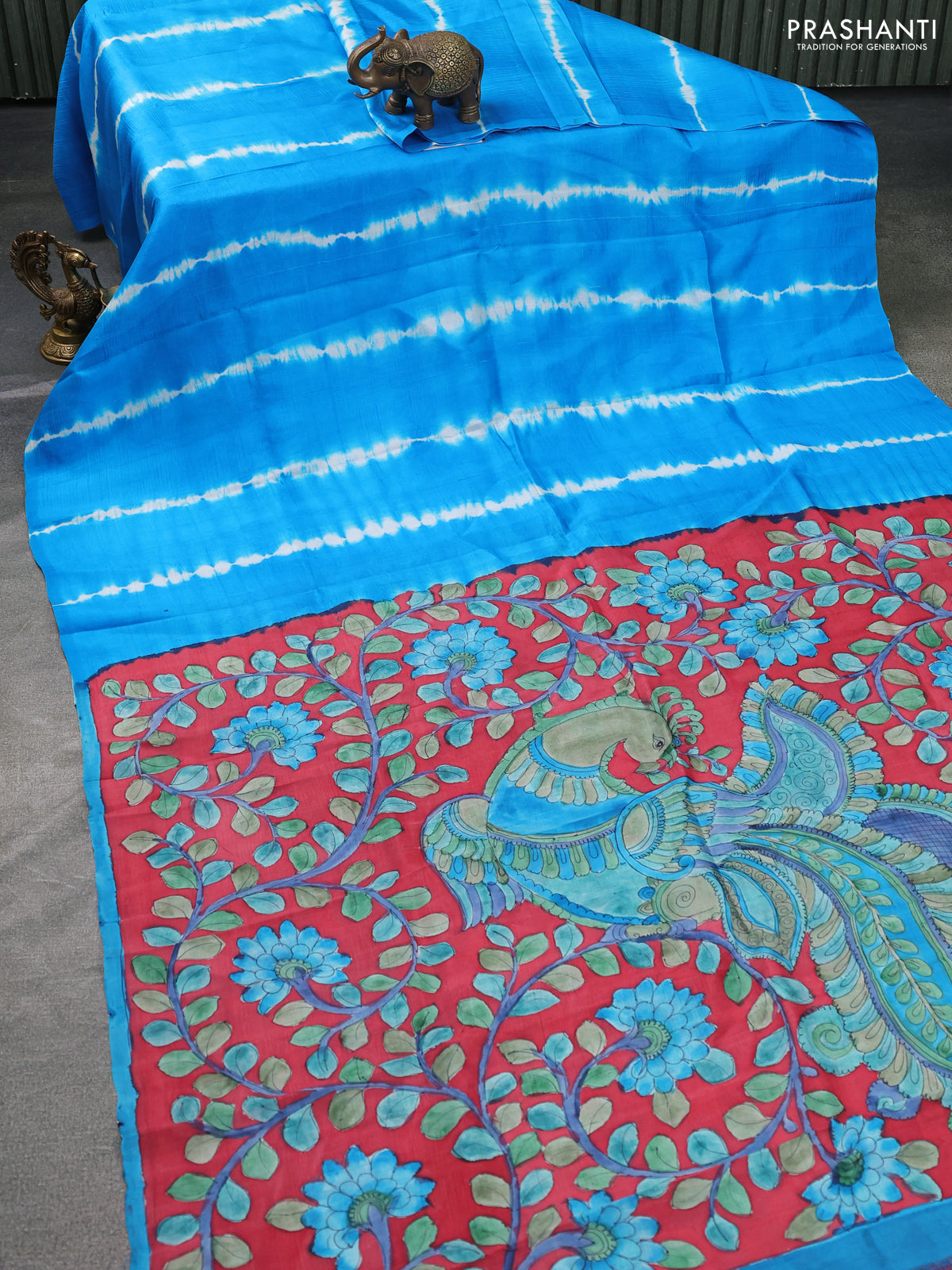 Printed silk saree cs blue and maroon with shibori prints and kalamkari hand painted pallu & blouse