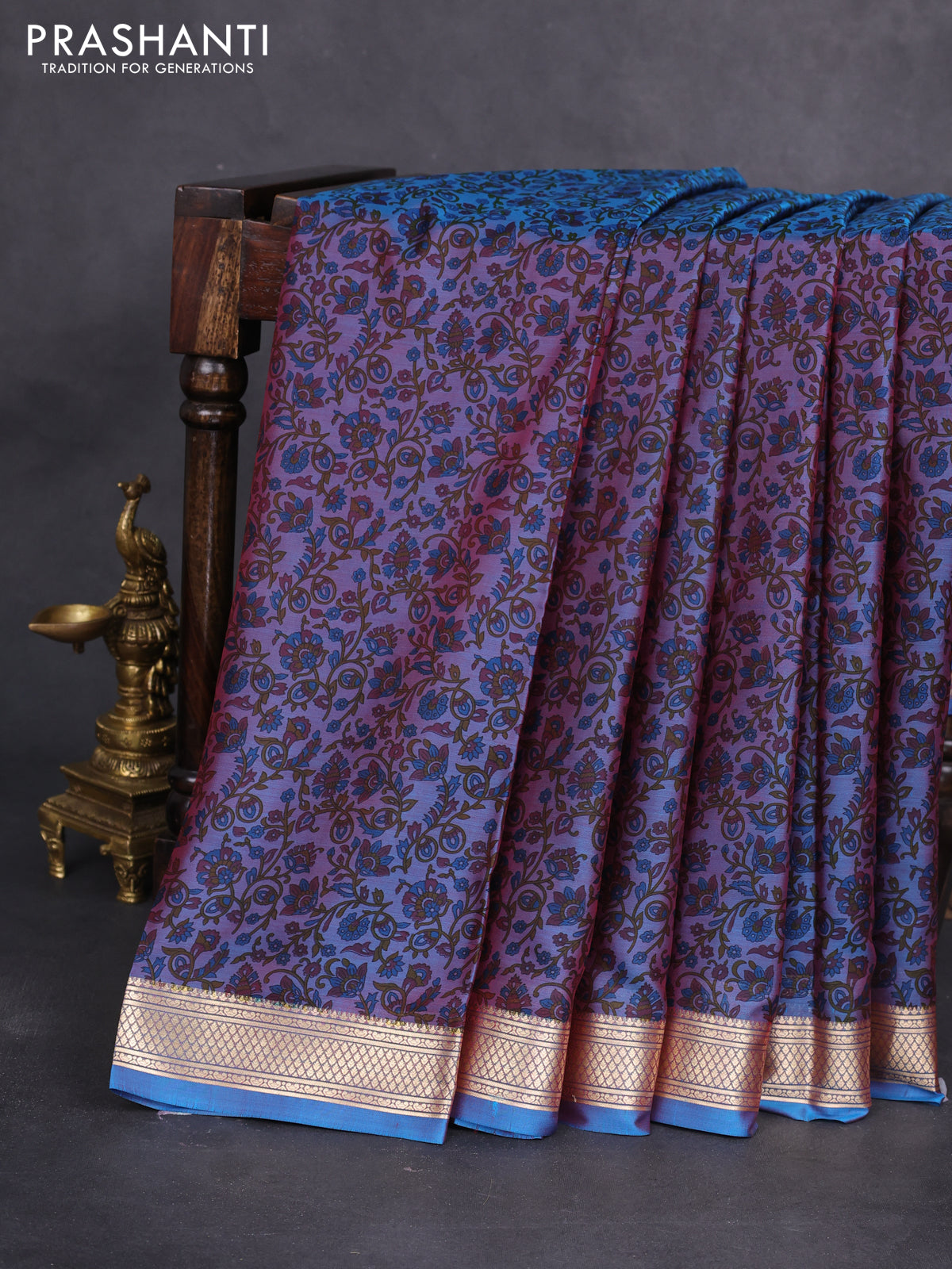 Printed silk saree dual shade of maroonish blue with allover prints and zari woven border