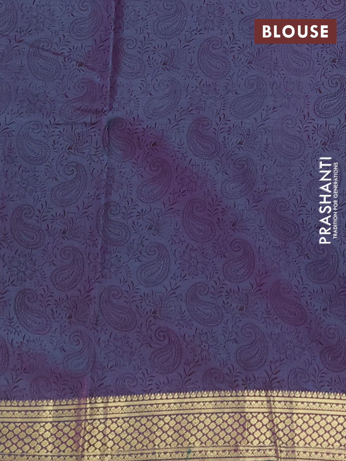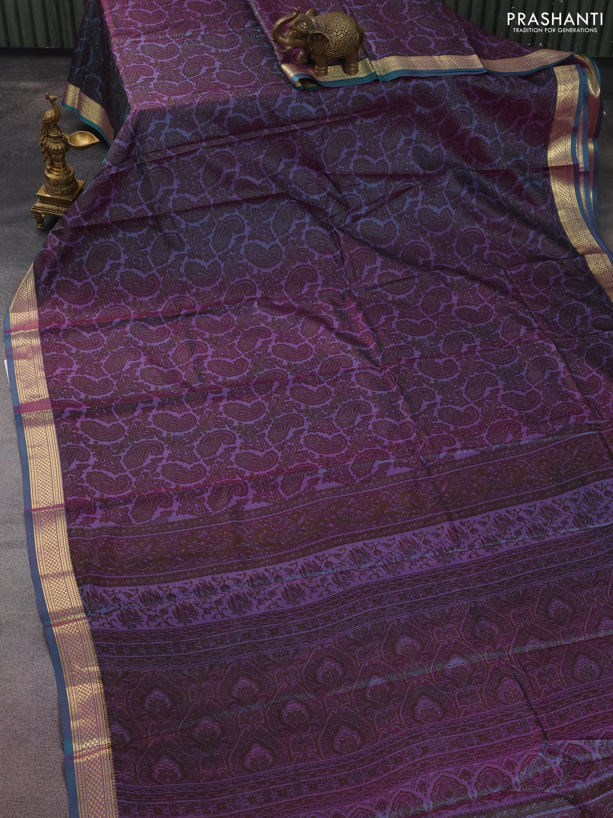 Printed silk saree dual shade of purple and teal green with allover paisley prints and zari woven border