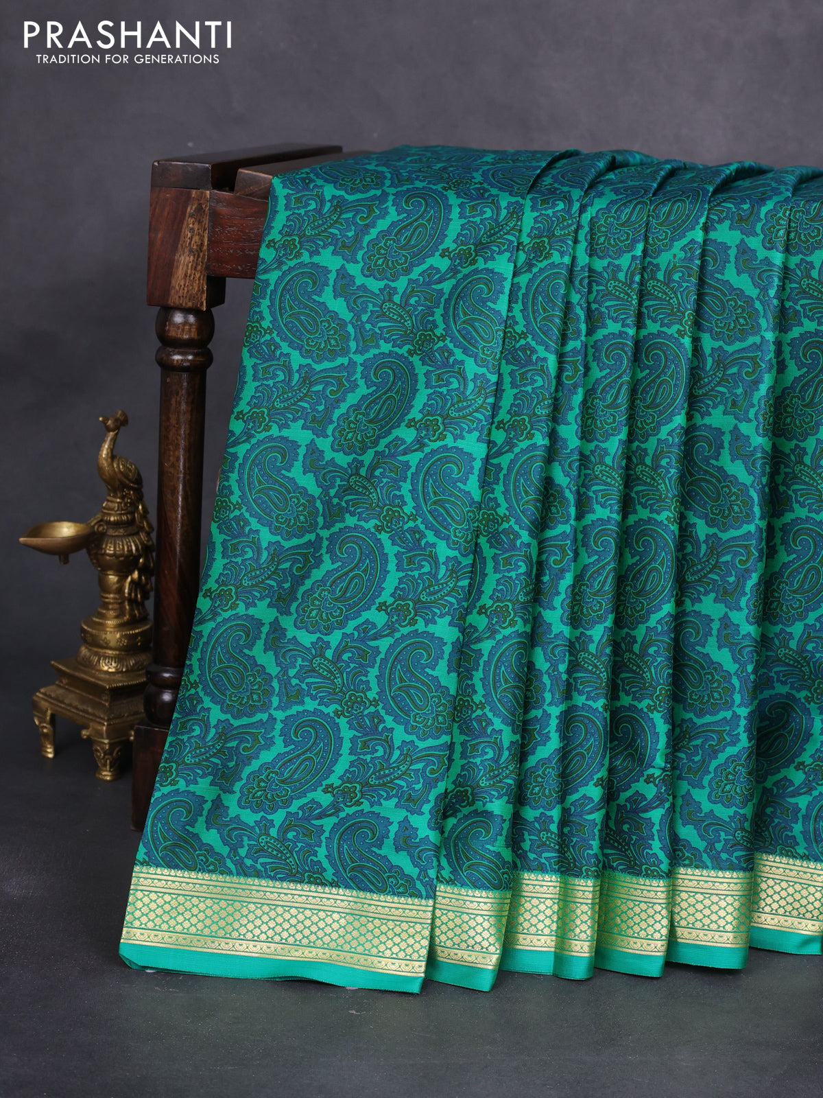 Printed silk saree green with allover paisley prints and zari woven border