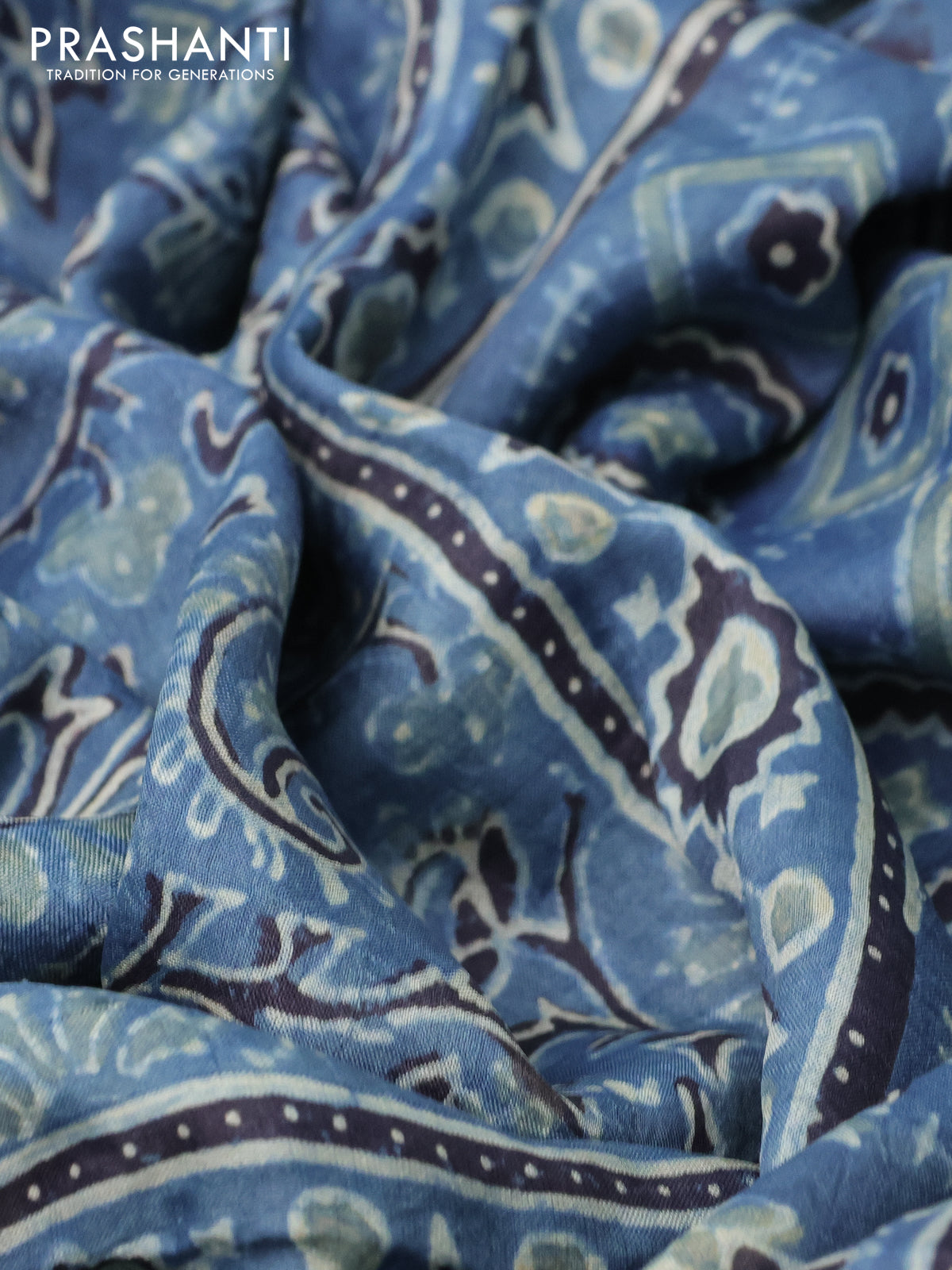 Printed silk saree indigo blue and black with allover ajrakh prints and simple border