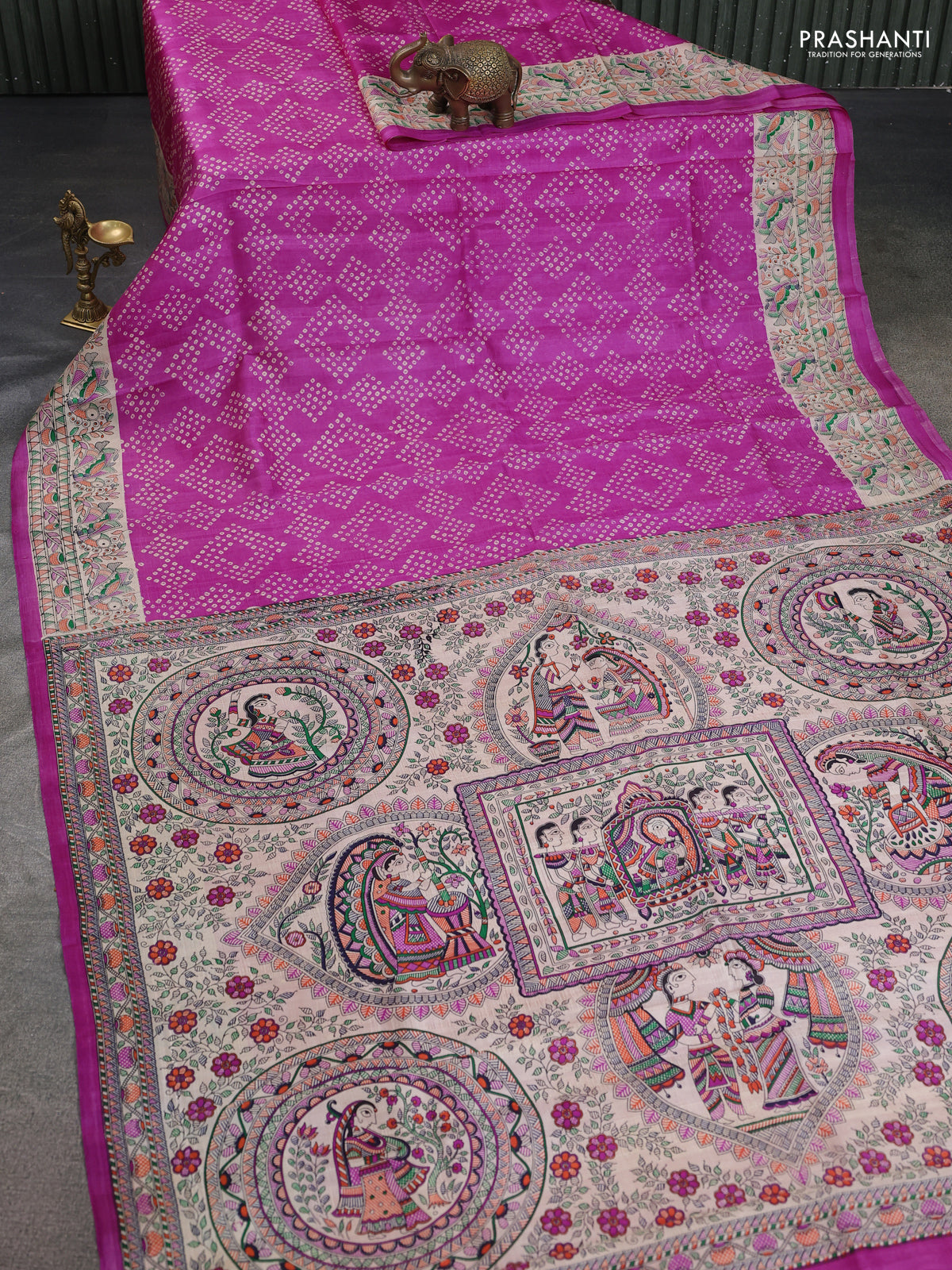 Madhubani Printed Silk sarees celebrated for their artistic motifs and rich cultural expression, perfect for graceful festive occasions and meaningful gifting. Curated by Prashanti, each piece reflects heritage charm, vibrant beauty, and timeless sophistication.