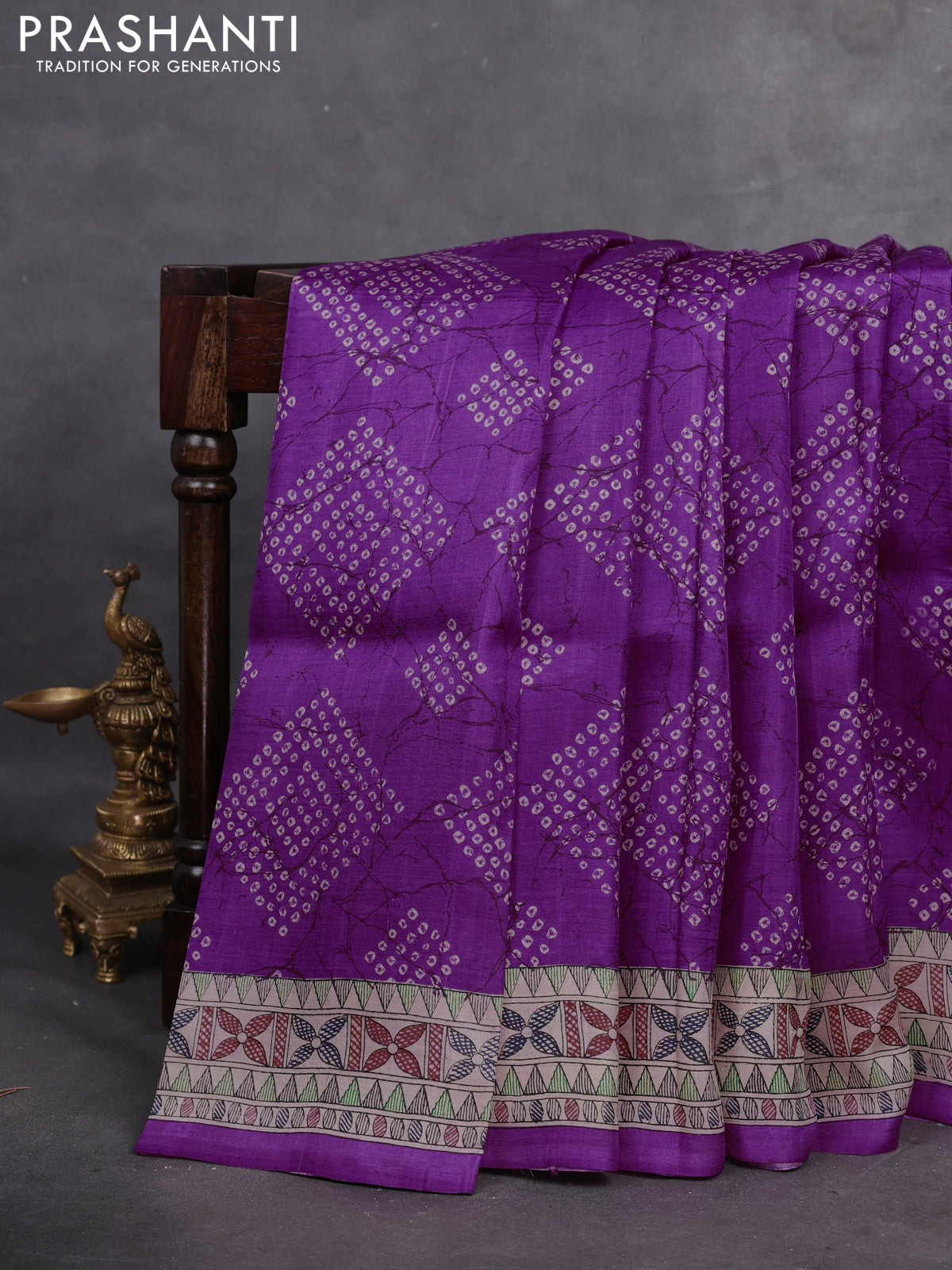 Printed silk saree purple and cream with allover bandhani prints and madhubani printed pallu & border