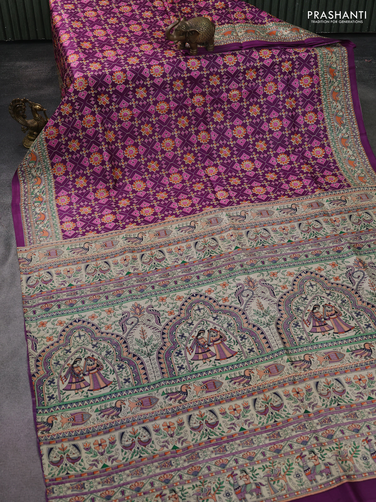 Printed silk saree purple and cream with allover ikat prints and madhubani printed pallu & border
