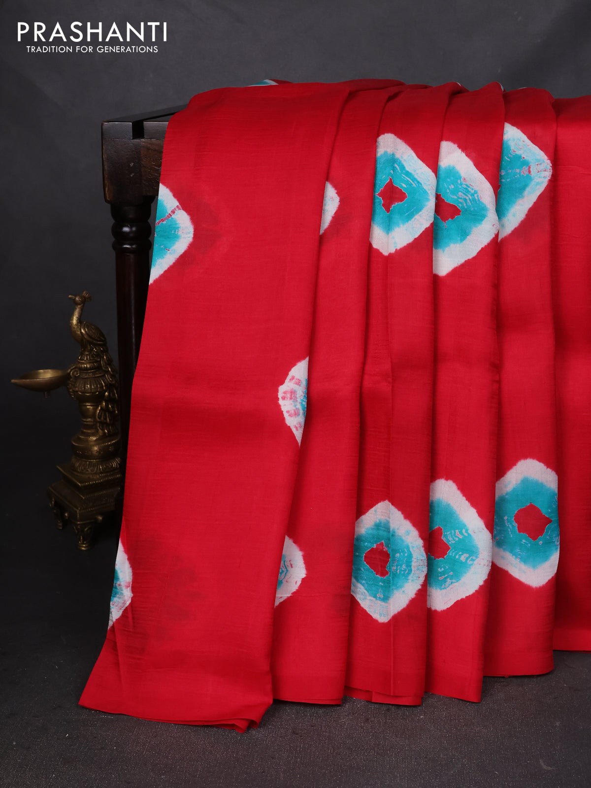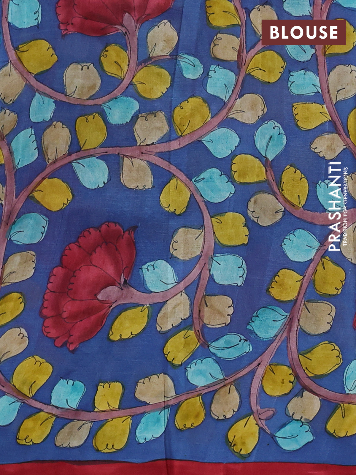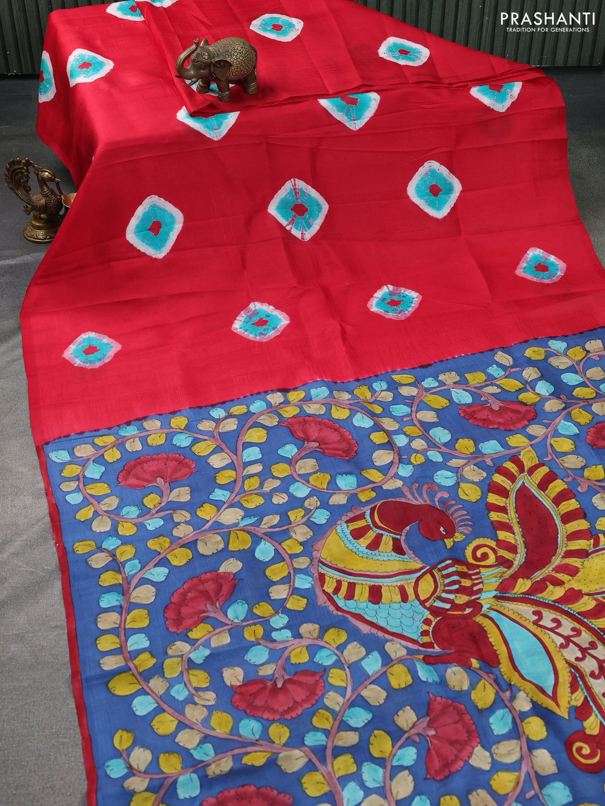 Printed silk saree red and blue with shibori butta prints and kalamkari hand painted pallu & blouse