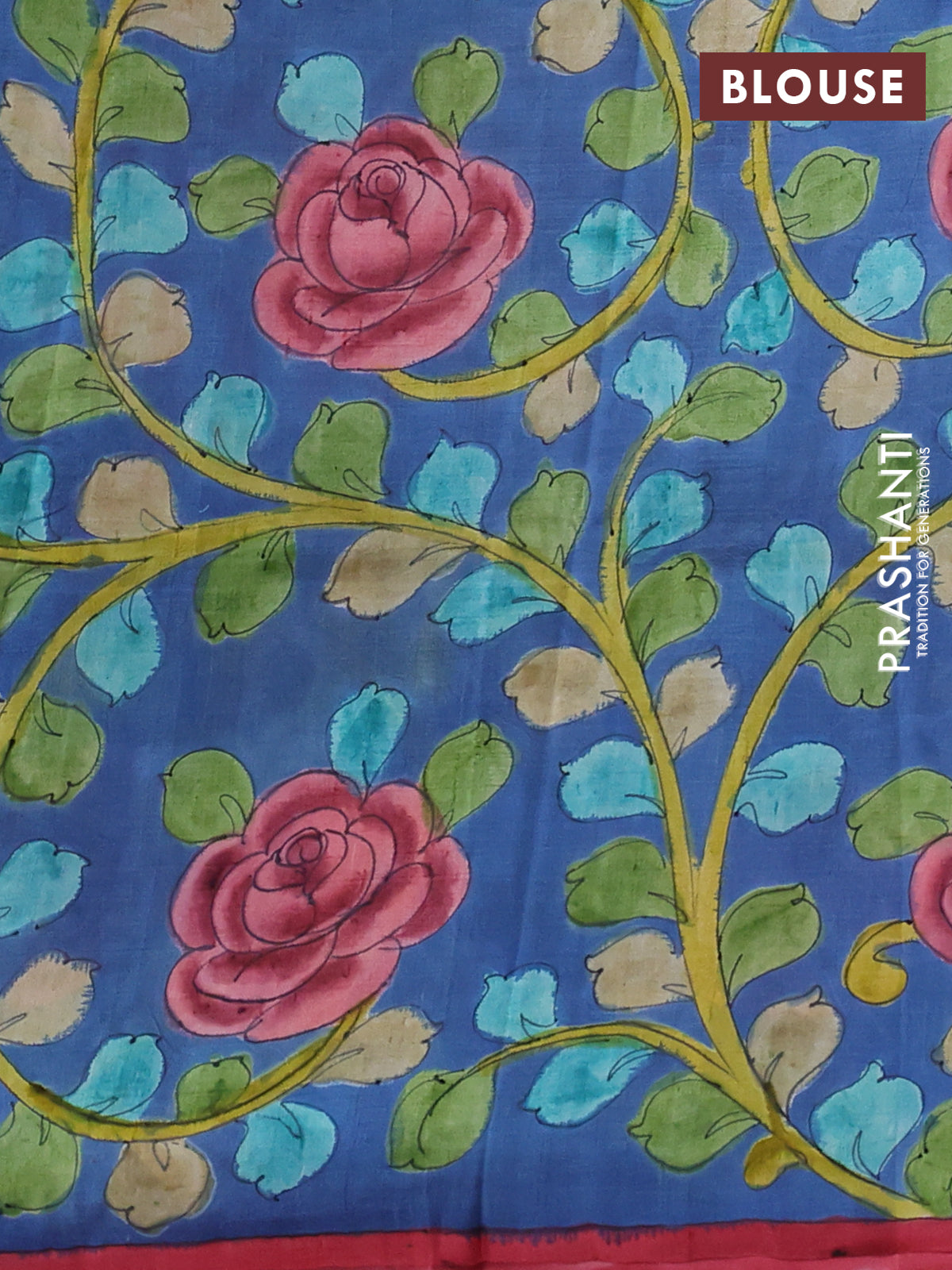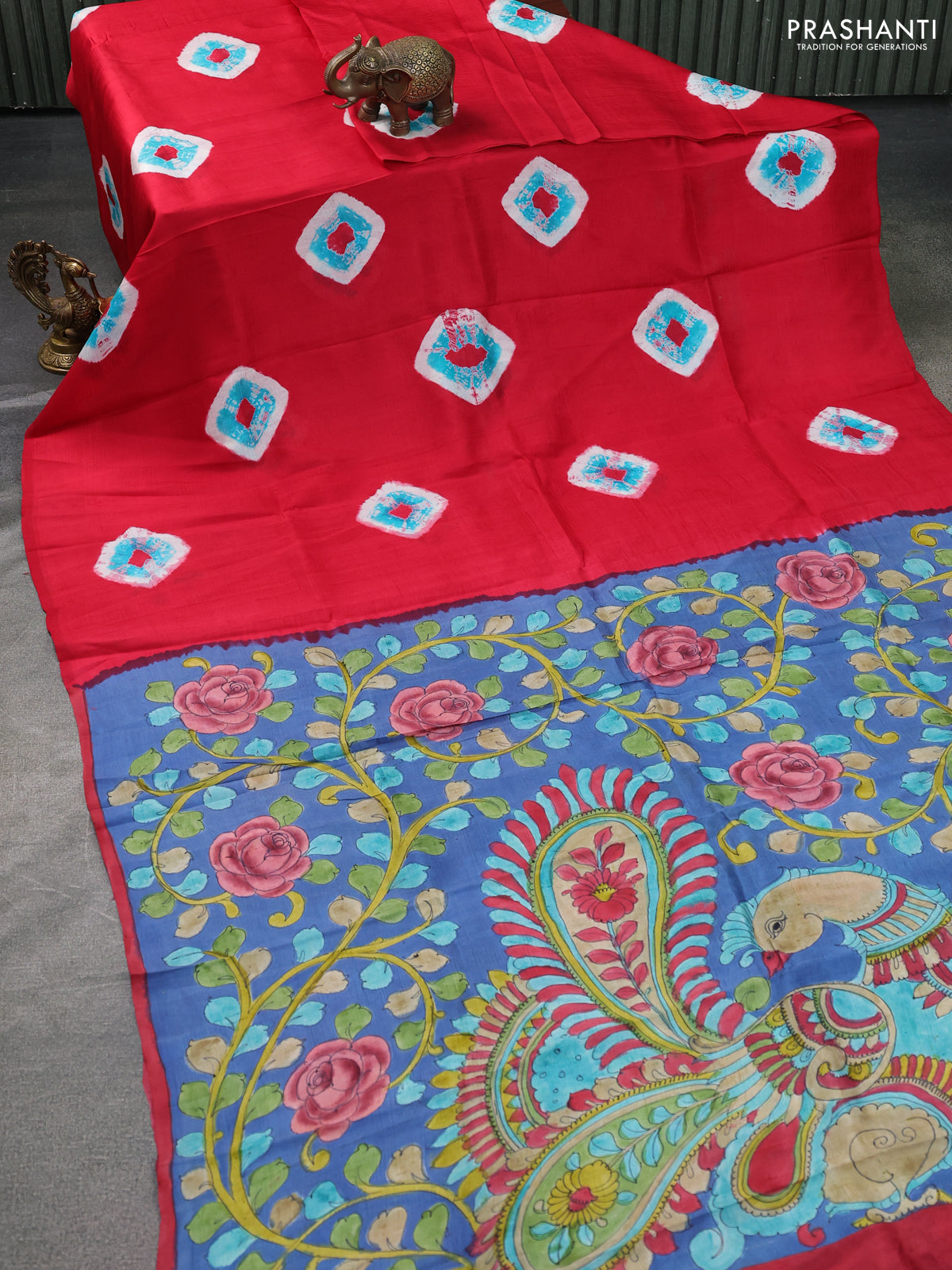 Printed silk saree red and blue with shibori butta prints and kalamkari hand painted pallu & blouse