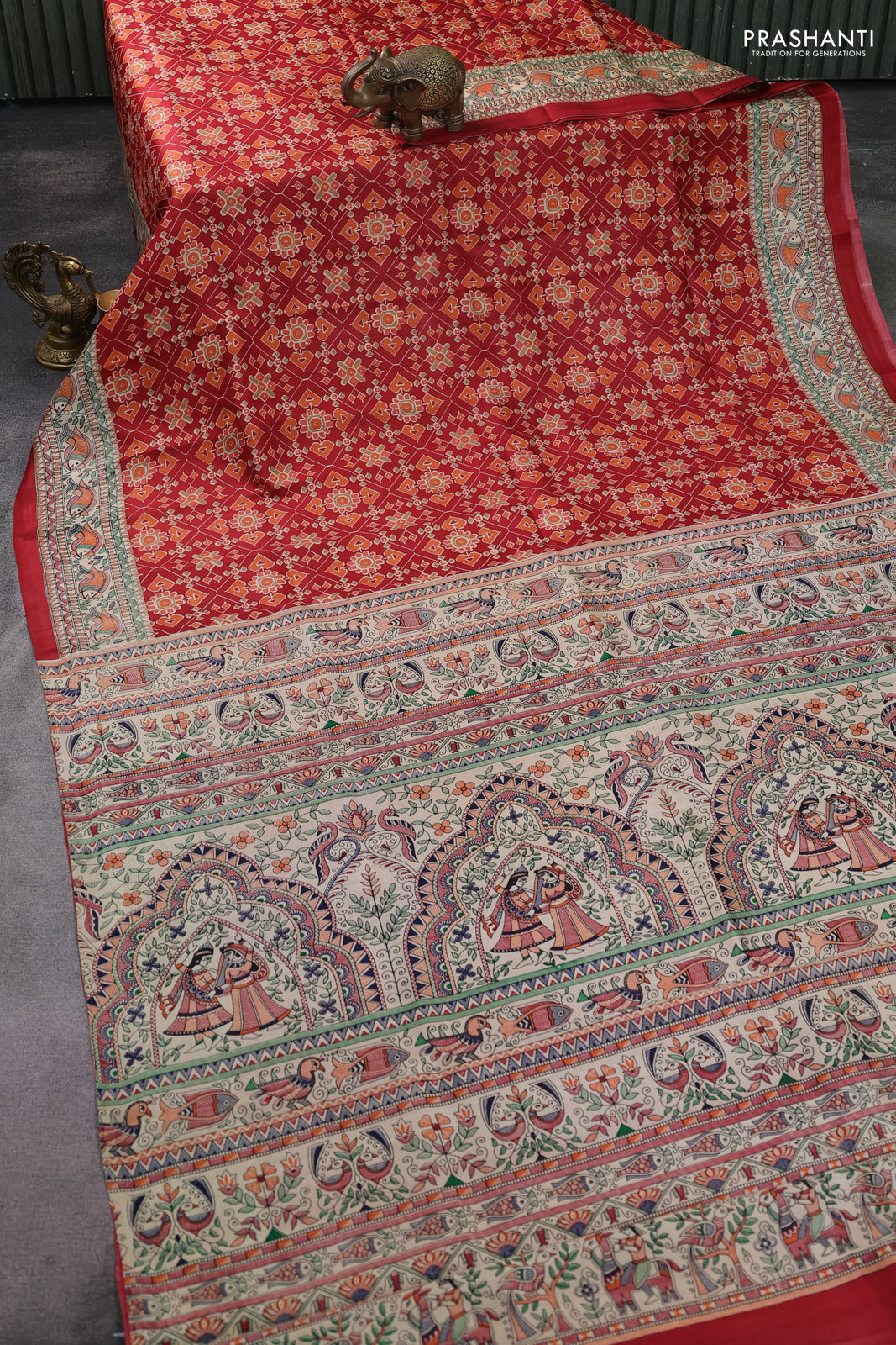 Printed silk saree red and cream with allover ikat prints and madhubani printed pallu & border